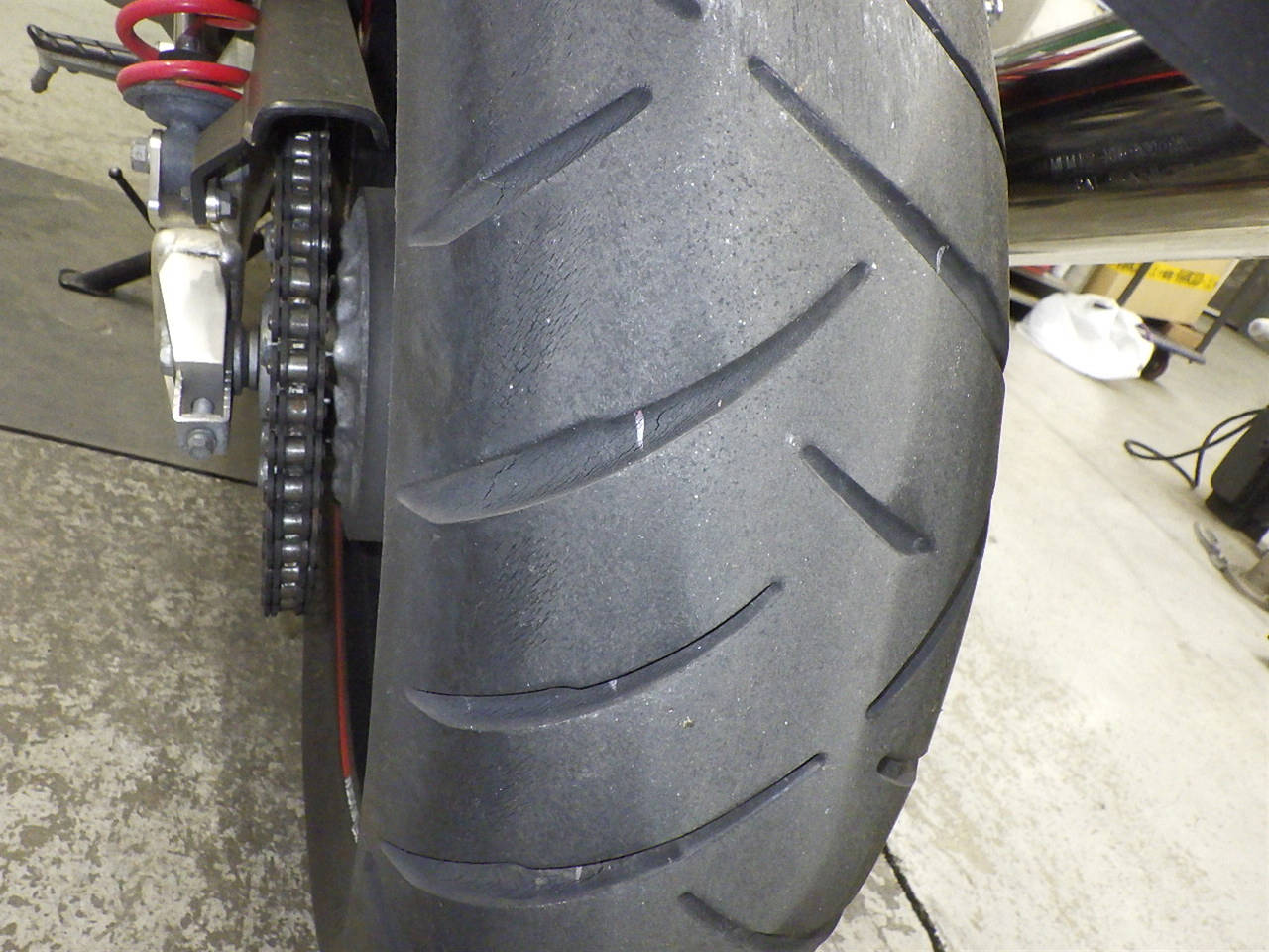 Задняя покрышка: Снижение давления в шине, Трещина требует замены.