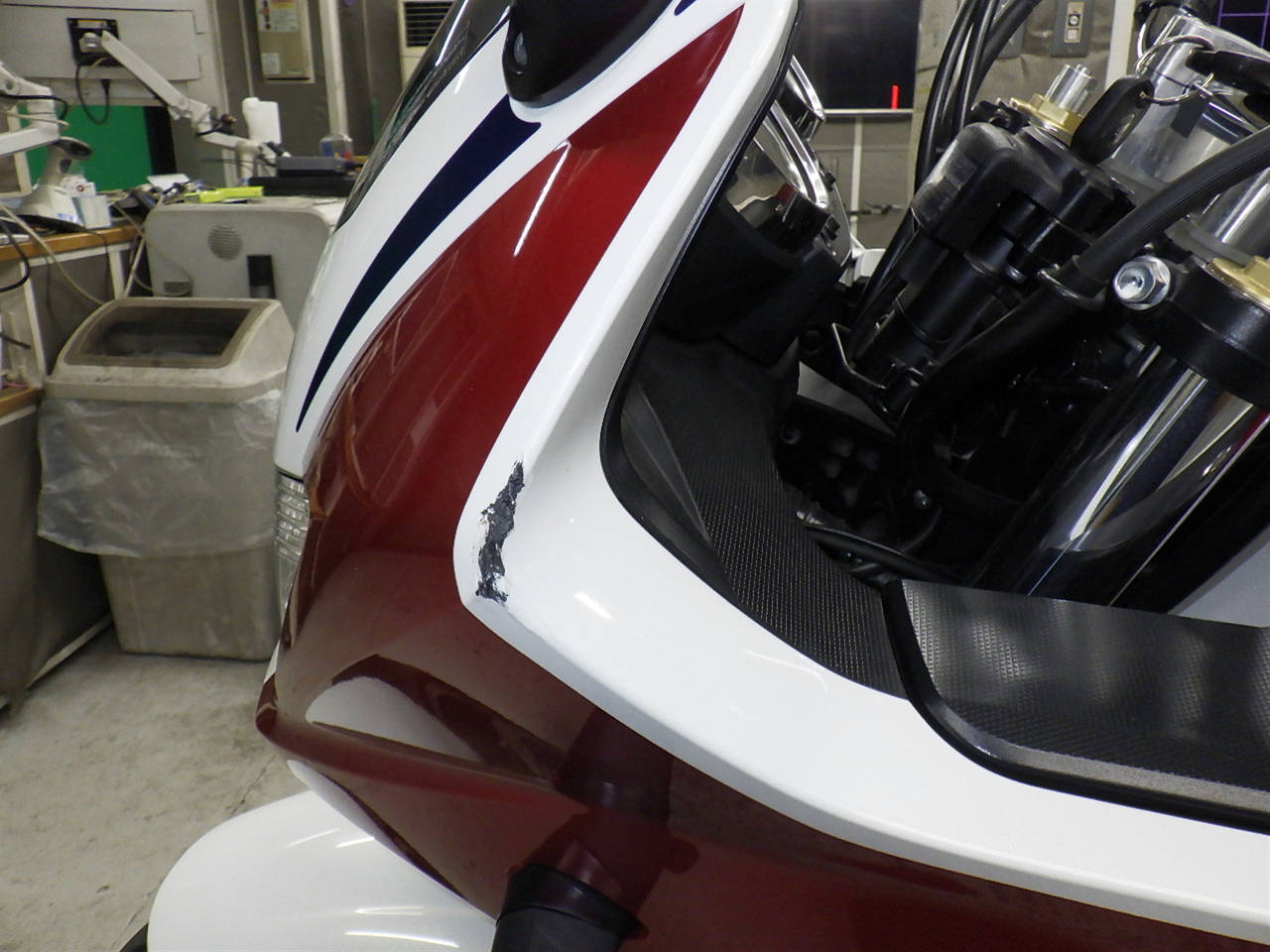 Передний пластик: Верхний недочет Уровень 3, Изгиб, Частичная покраска, Потёртость