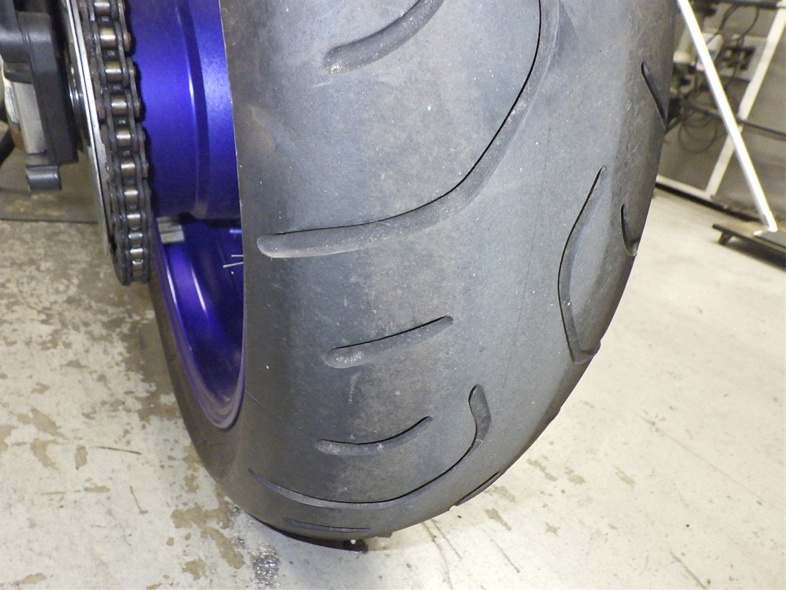 Передняя покрышка: Снижение давления в шине, Трещина требует замены.