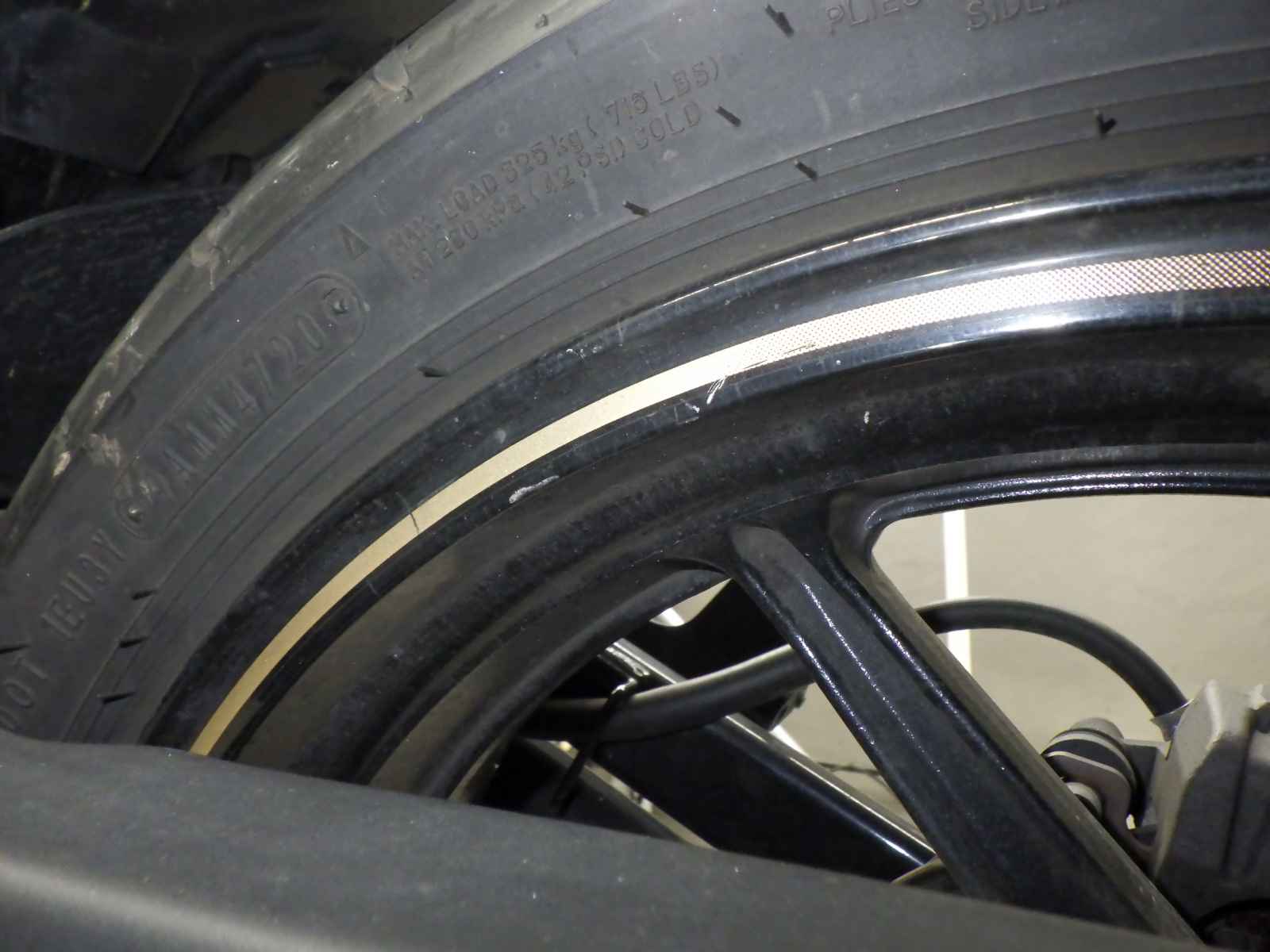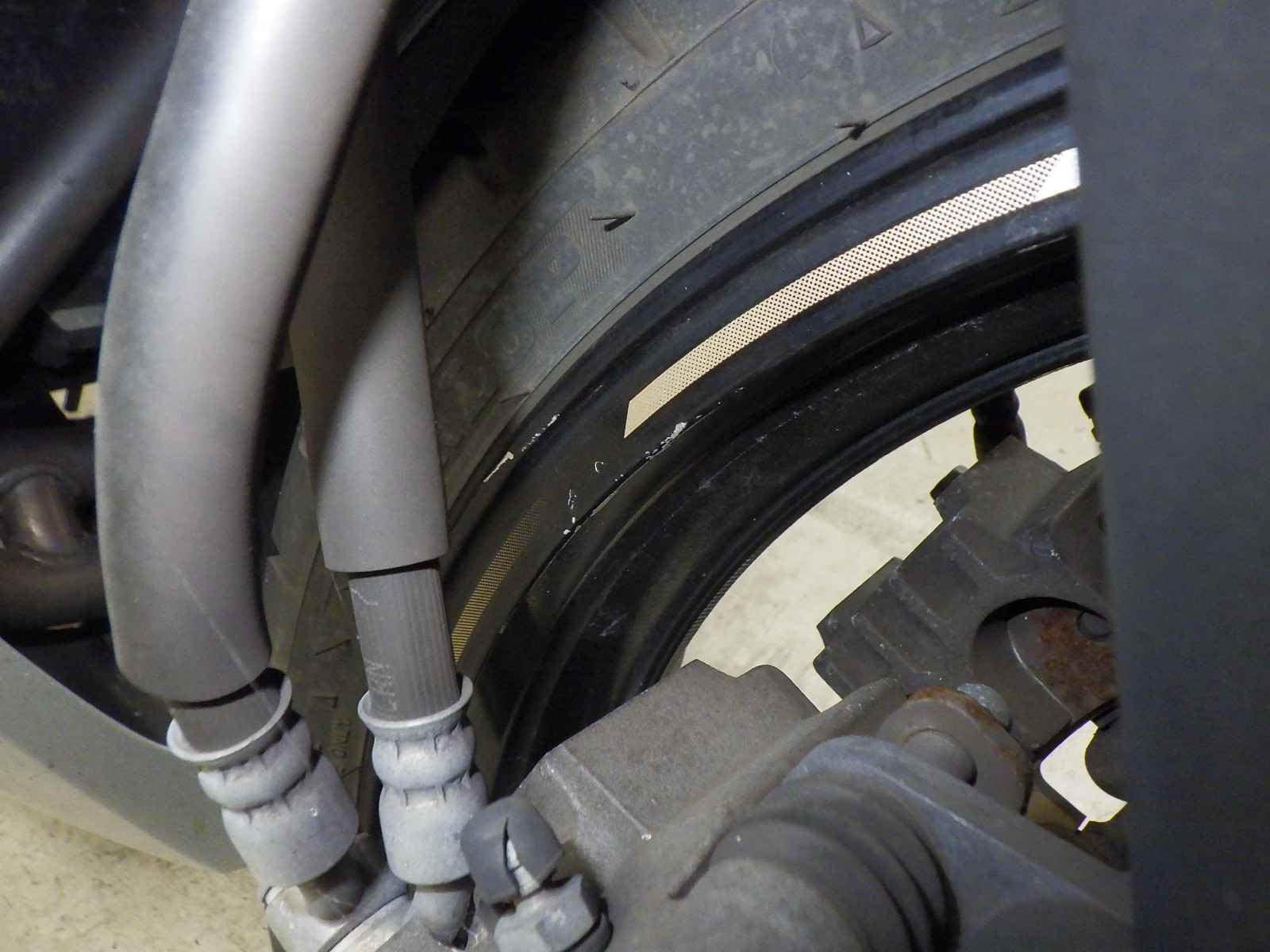 Передняя покрышка: Снижение давления в шине, Трещина требует замены.