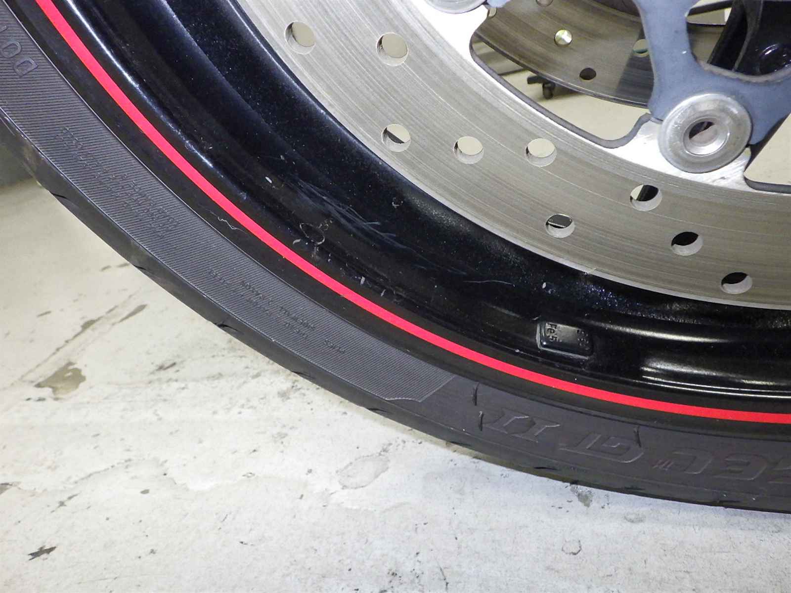 Передняя покрышка: Снижение давления в шине, Трещина требует замены.