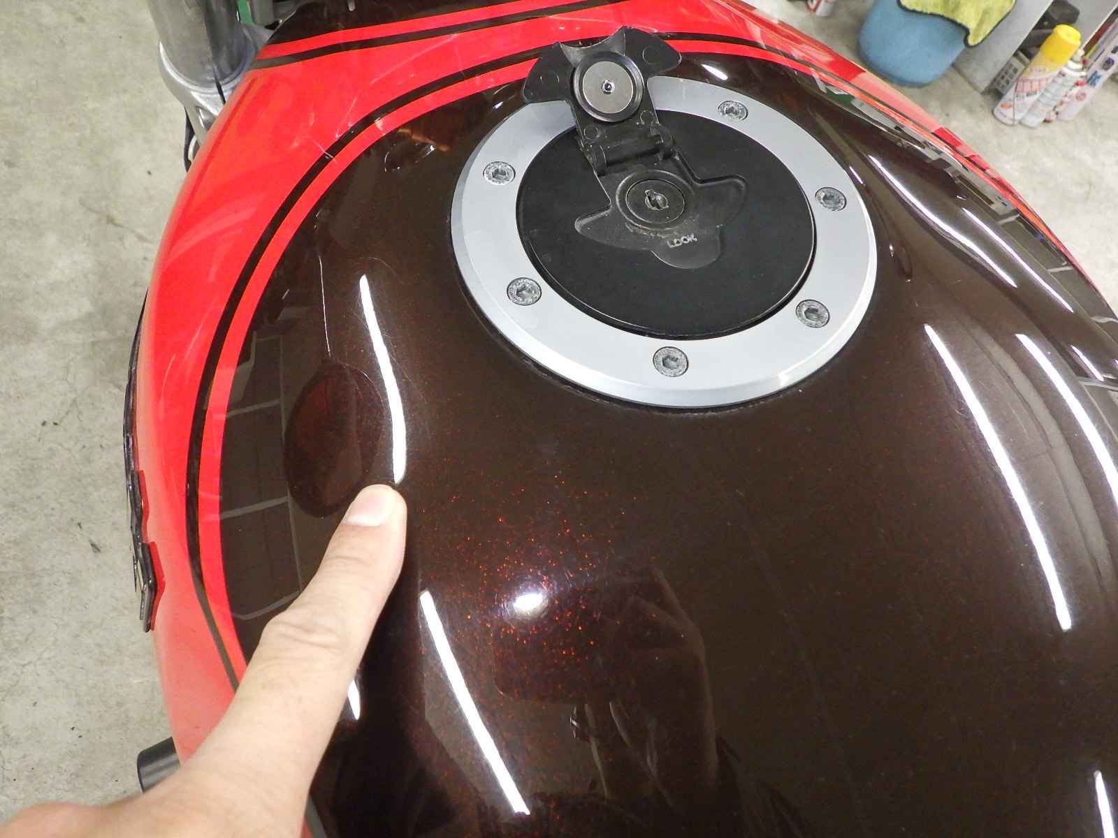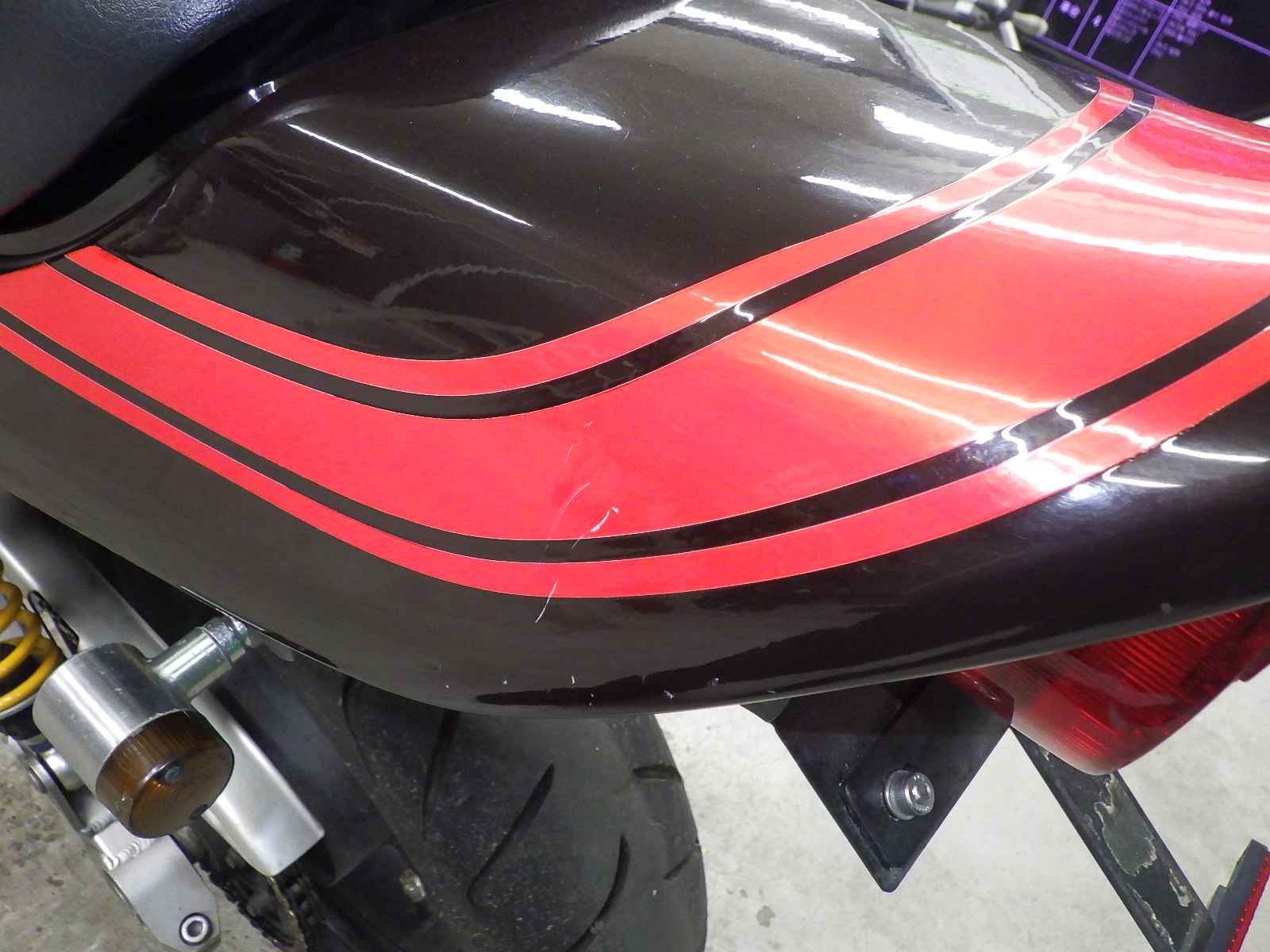 Бензобак: Недочет бака, Вмятина, Незначительно, Частичная покраска, Незначительно, облезлая краска, Внутренняя окисление, Незначительно