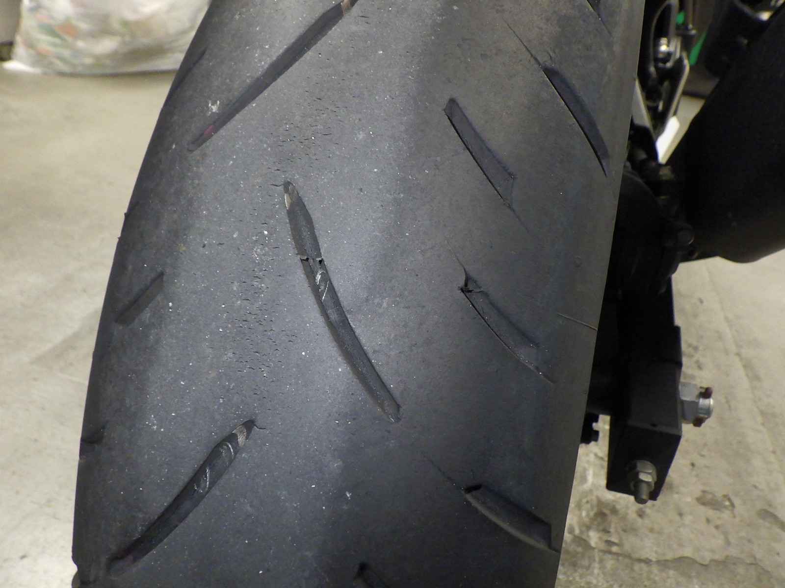 Задняя покрышка: Трещина на шине, требуется замена.