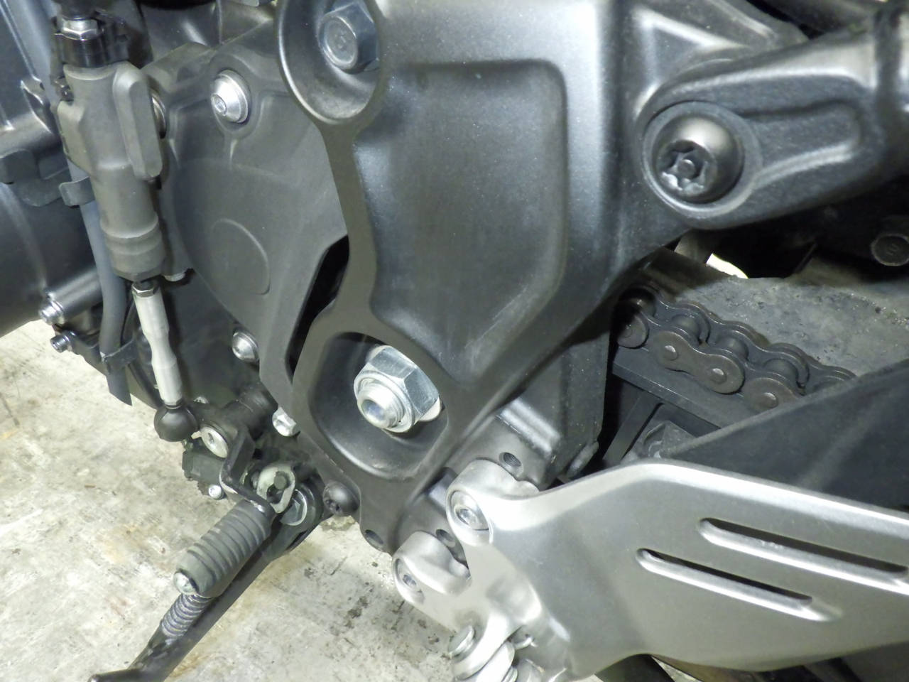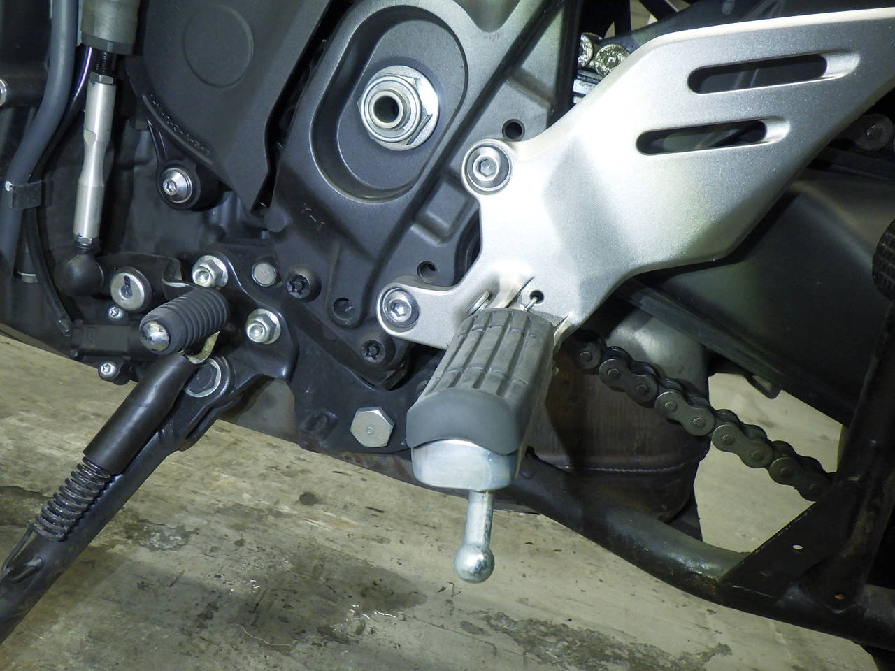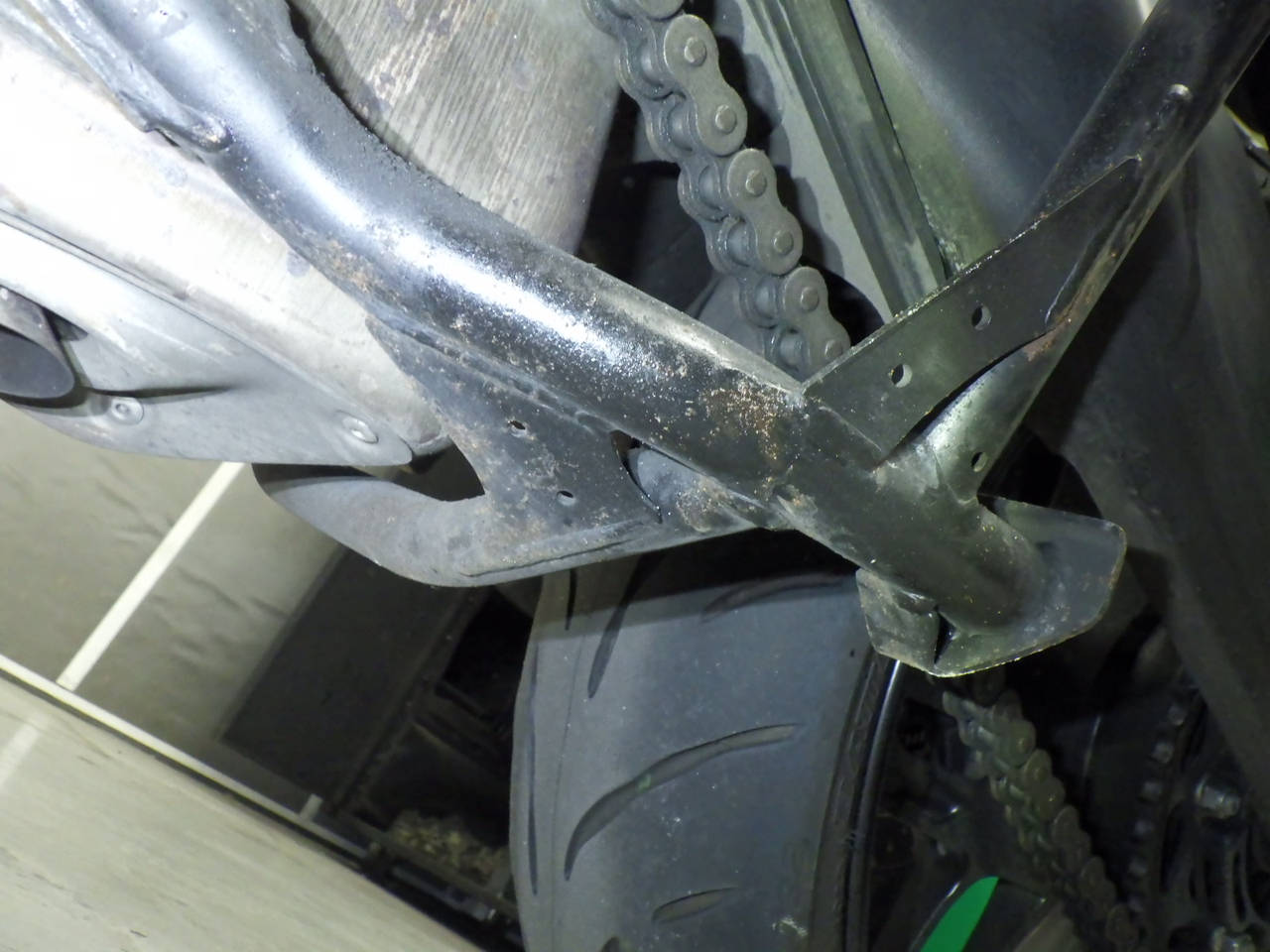 Подножка мотоцикла: Окисление на подножке Уровень 3, Частичная покраска, Остается без особых недочетов., Изгиб