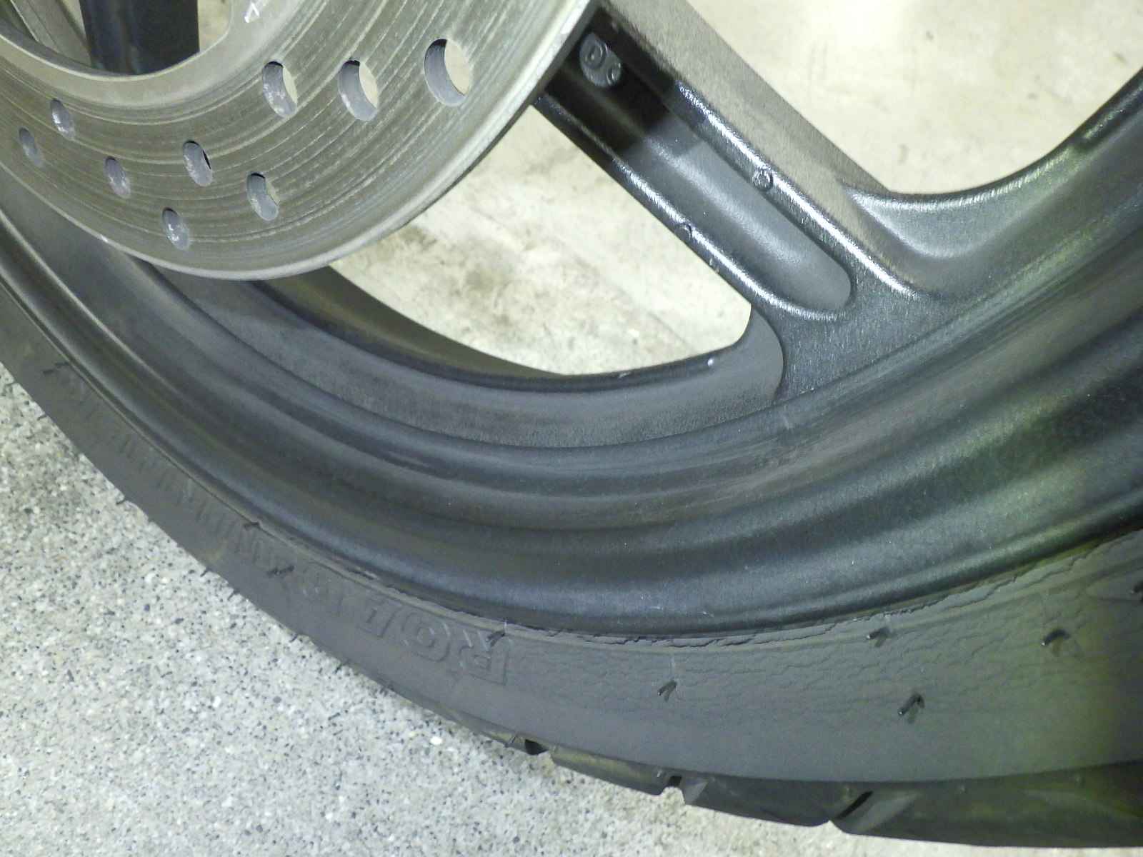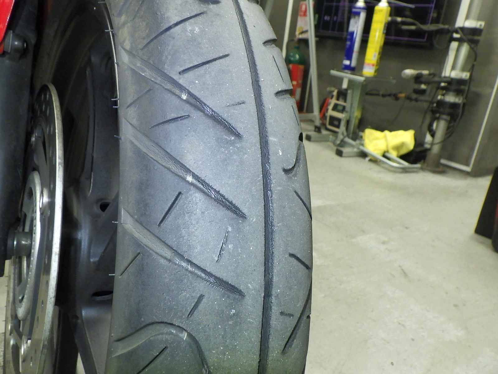 Передняя покрышка: Снижение давления в шине, Трещина требует замены.