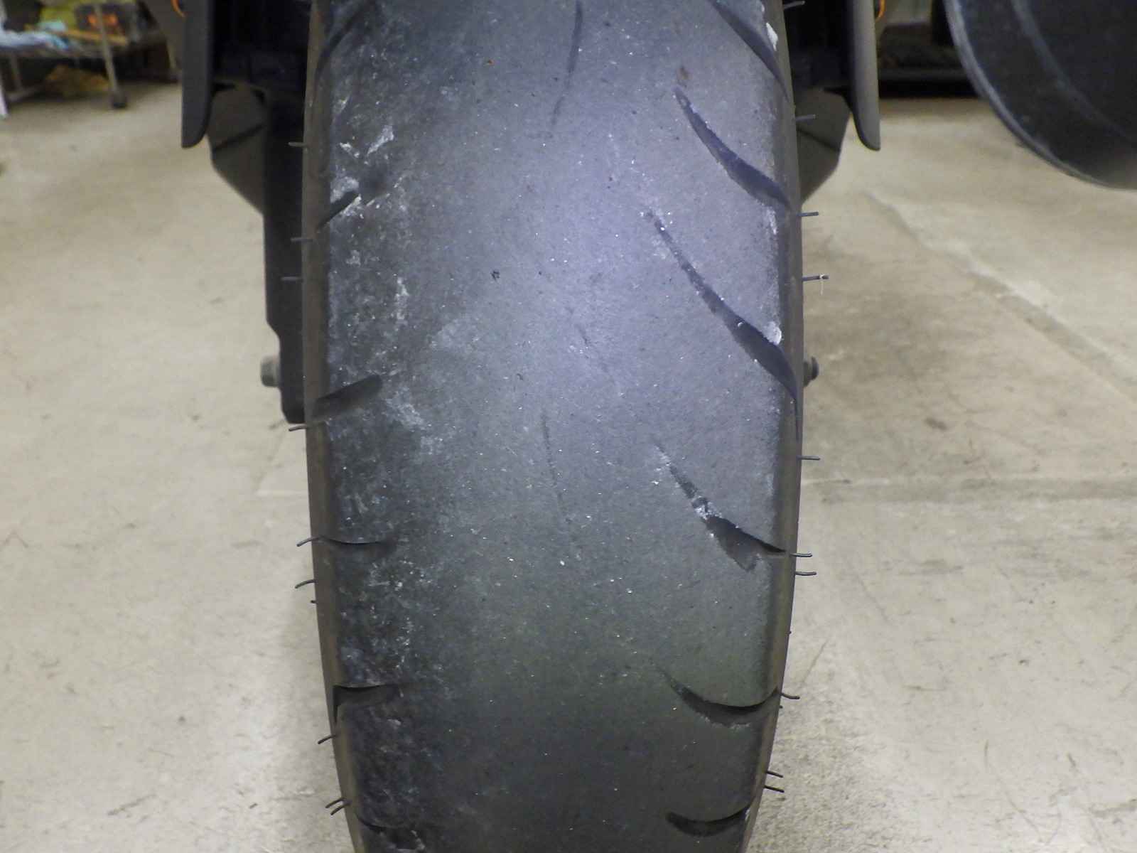 Передняя покрышка: Снижение давления в шине, Трещина требует замены.