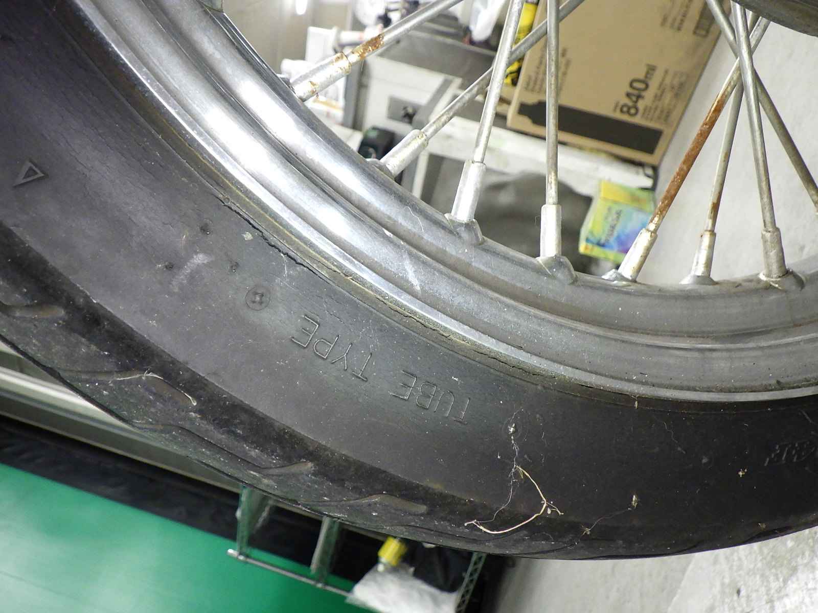 Передняя покрышка: Трещина на шине, требуется замена.