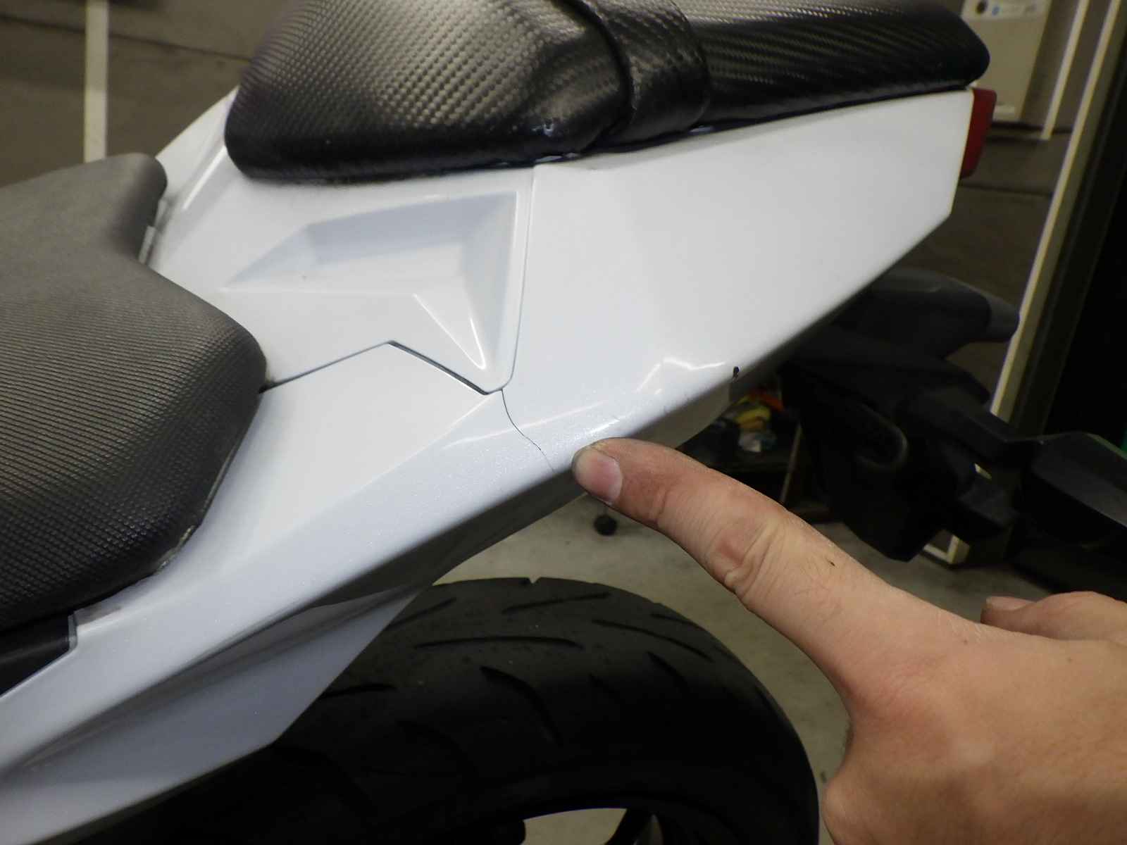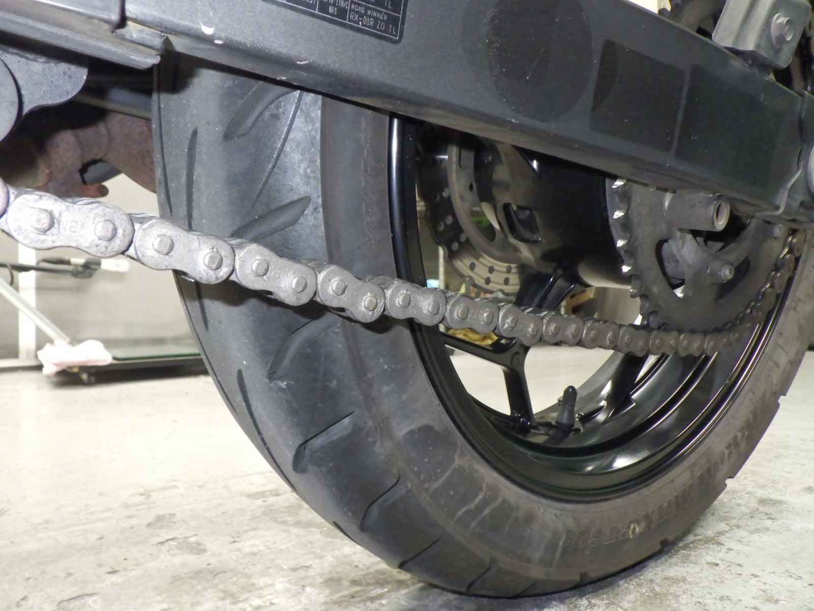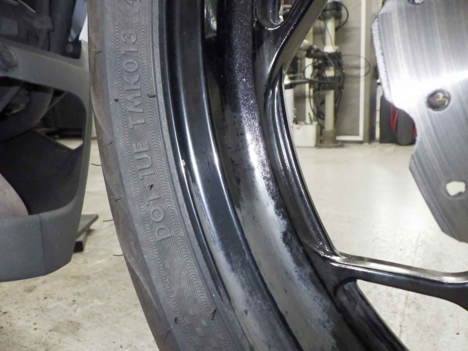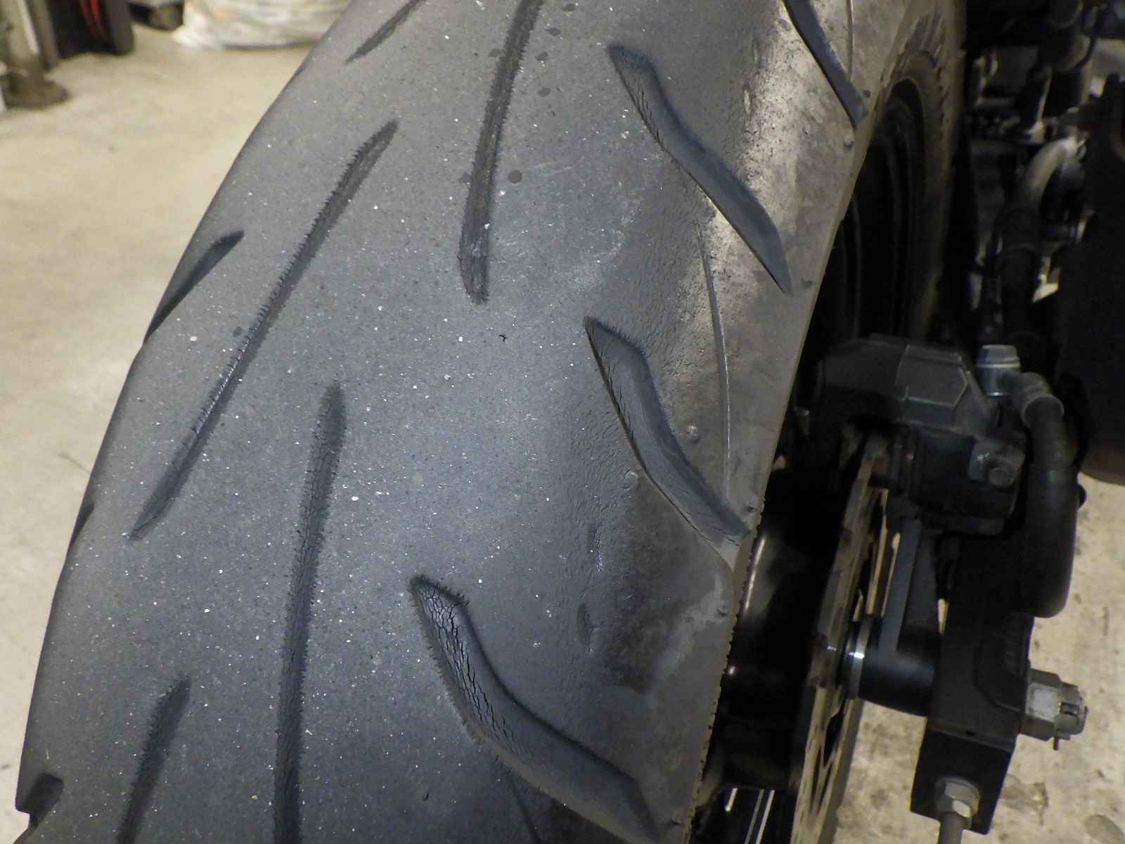 Задняя покрышка: Снижение давления в шине, Трещина требует замены.