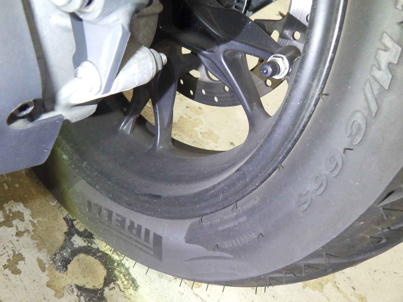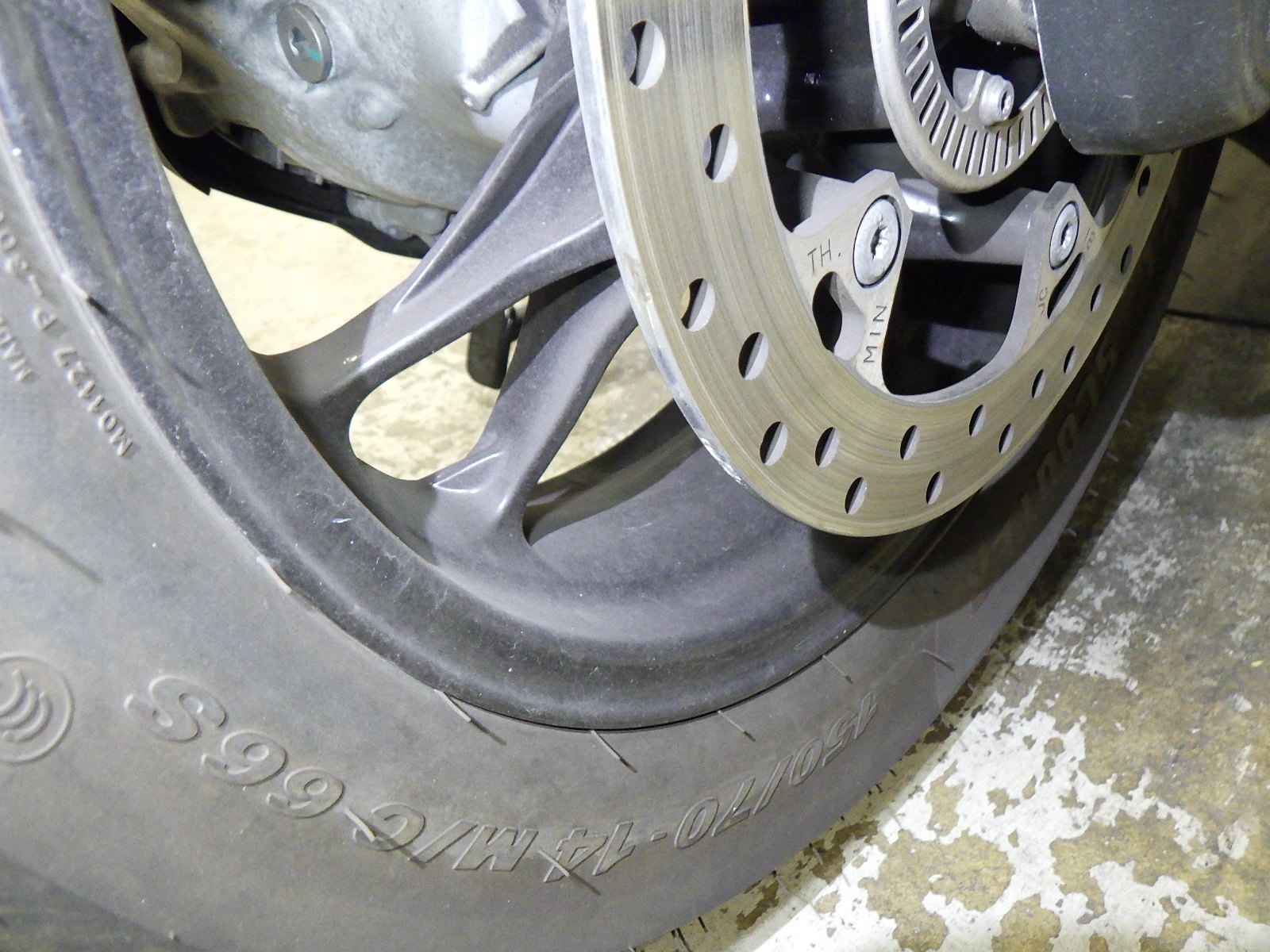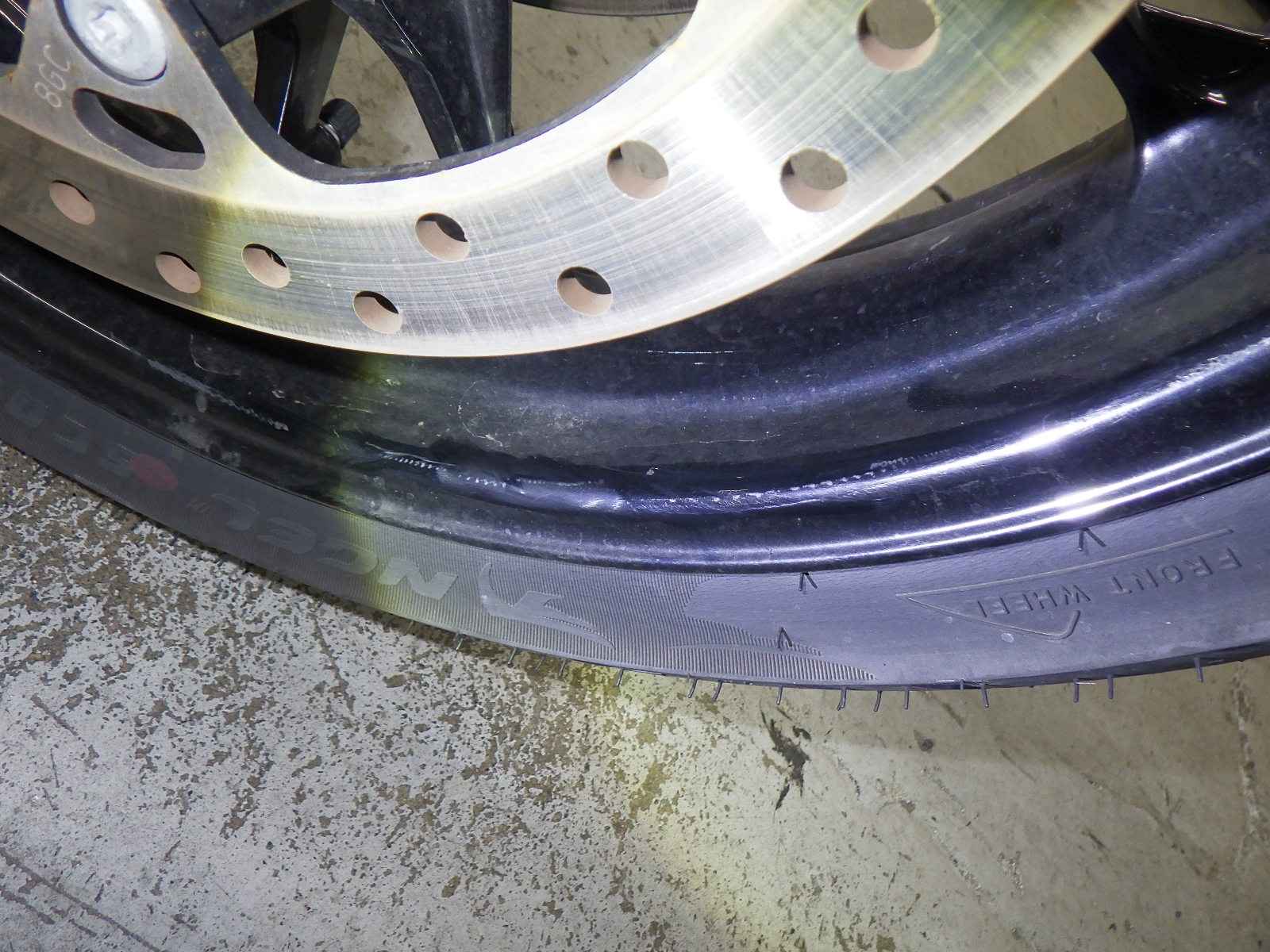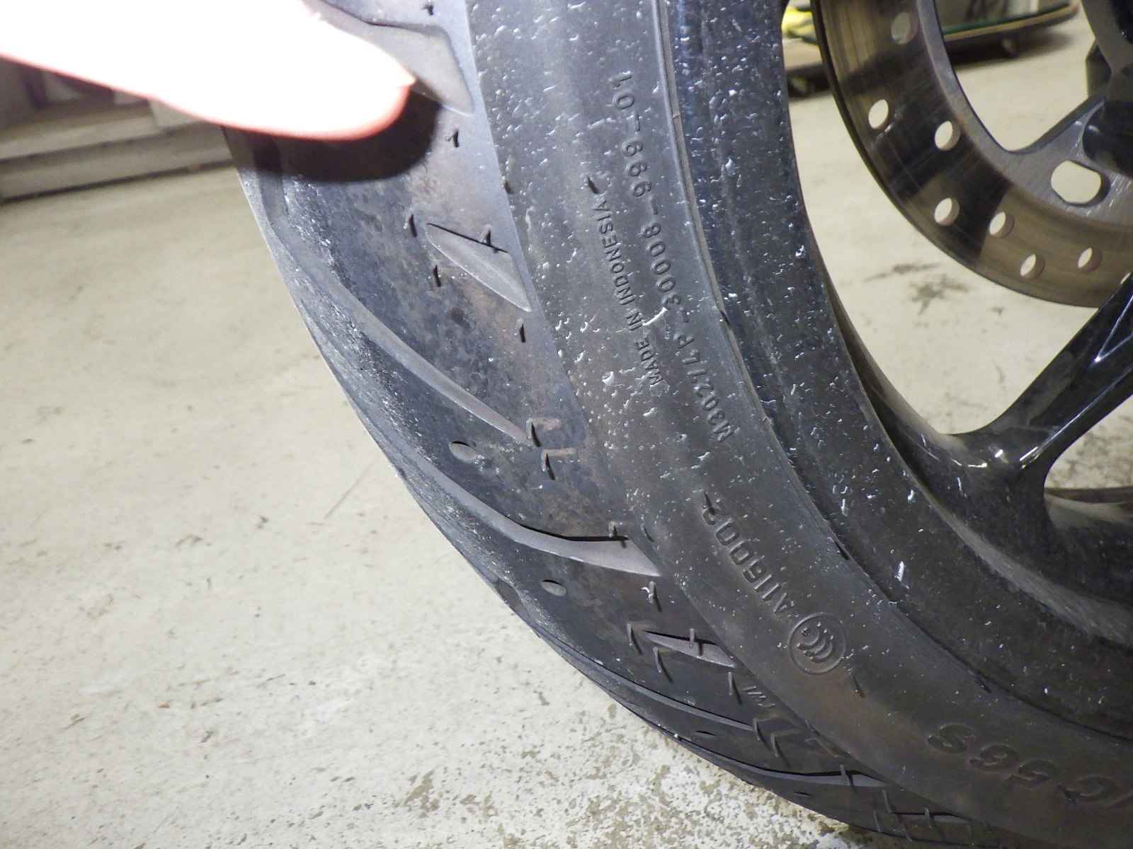 Передняя покрышка: Трещина на шине, требуется замена.