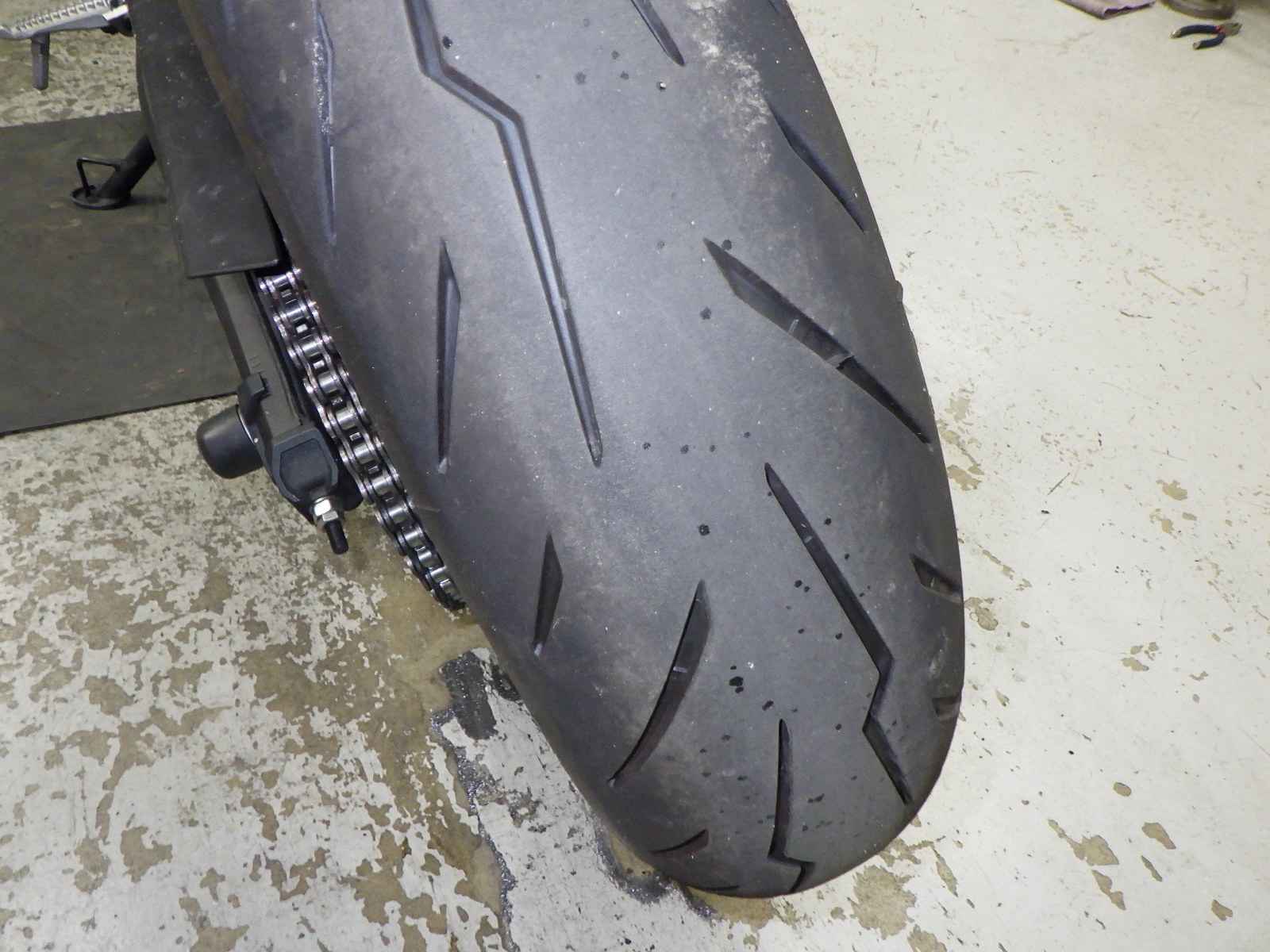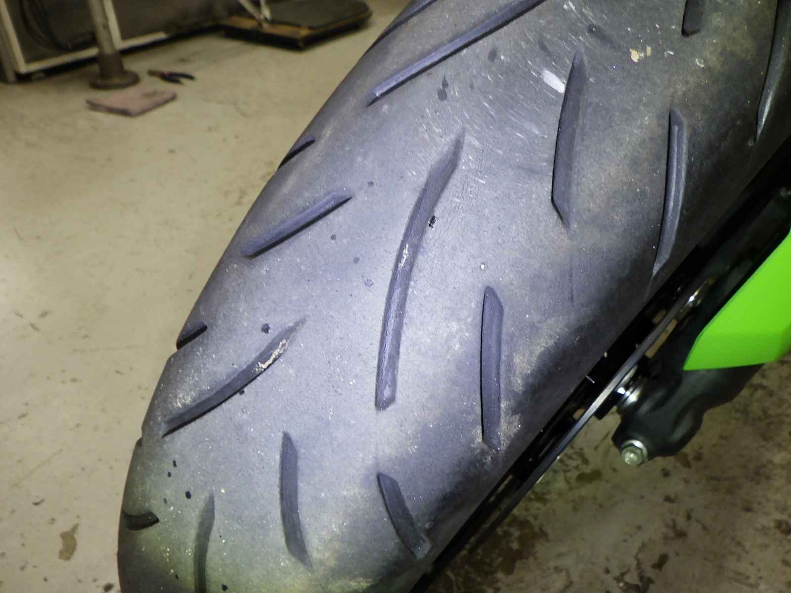 Передняя покрышка: Снижение давления в шине, Трещина требует замены.