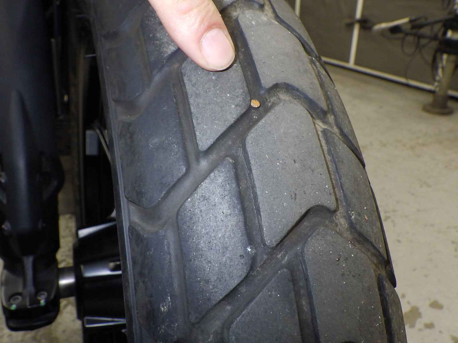 Передняя покрышка: Снижение давления в шине, Трещина требует замены., Требуется замена, Отверстие