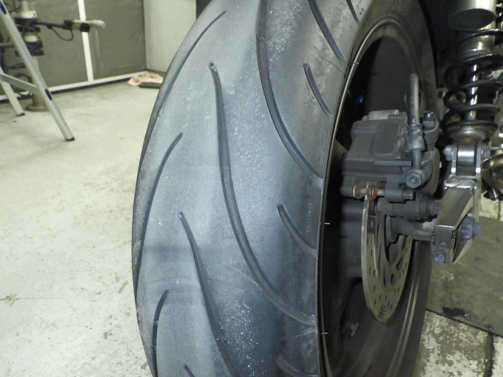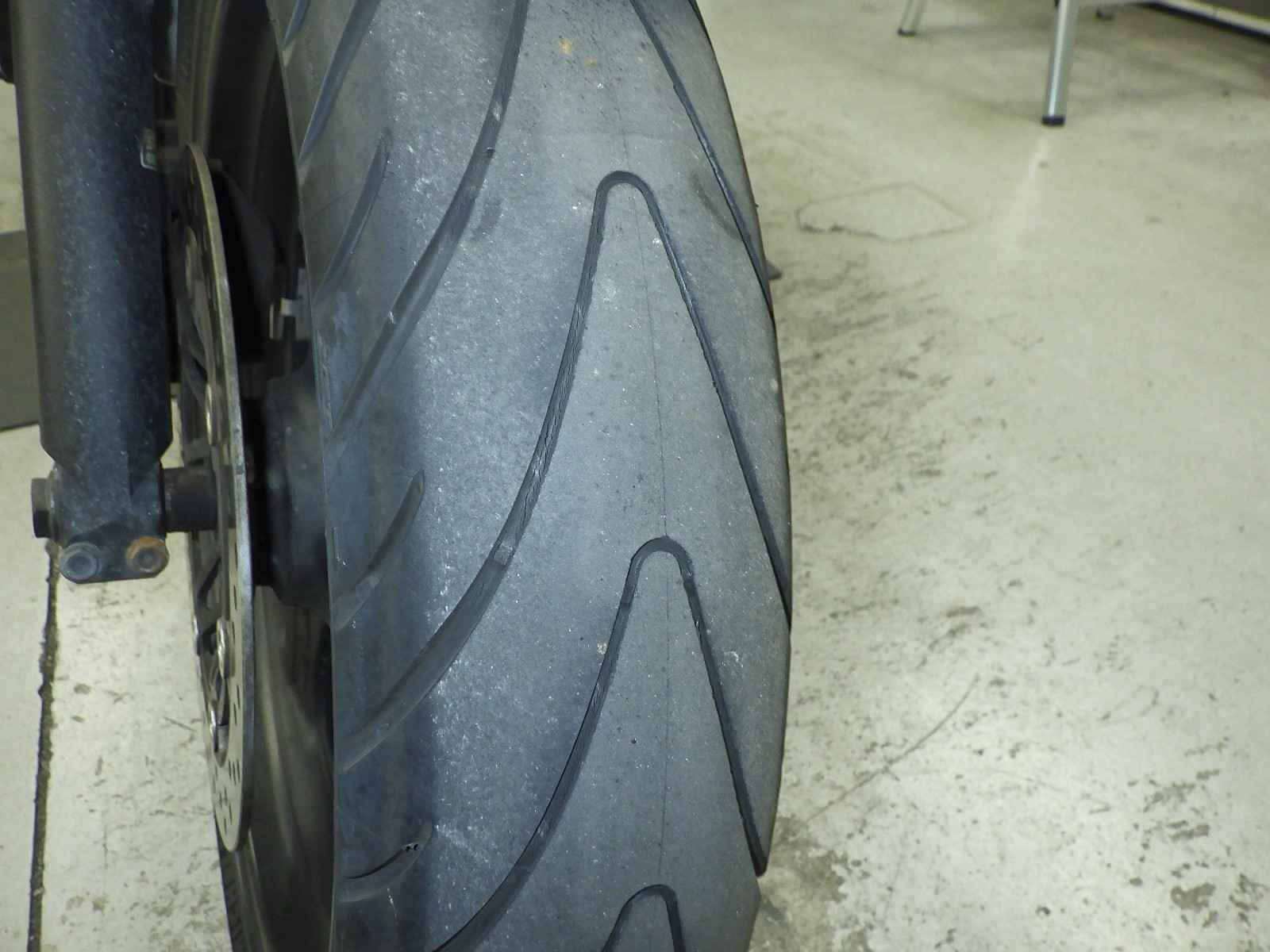 Передняя покрышка: Снижение давления в шине, Трещина требует замены.
