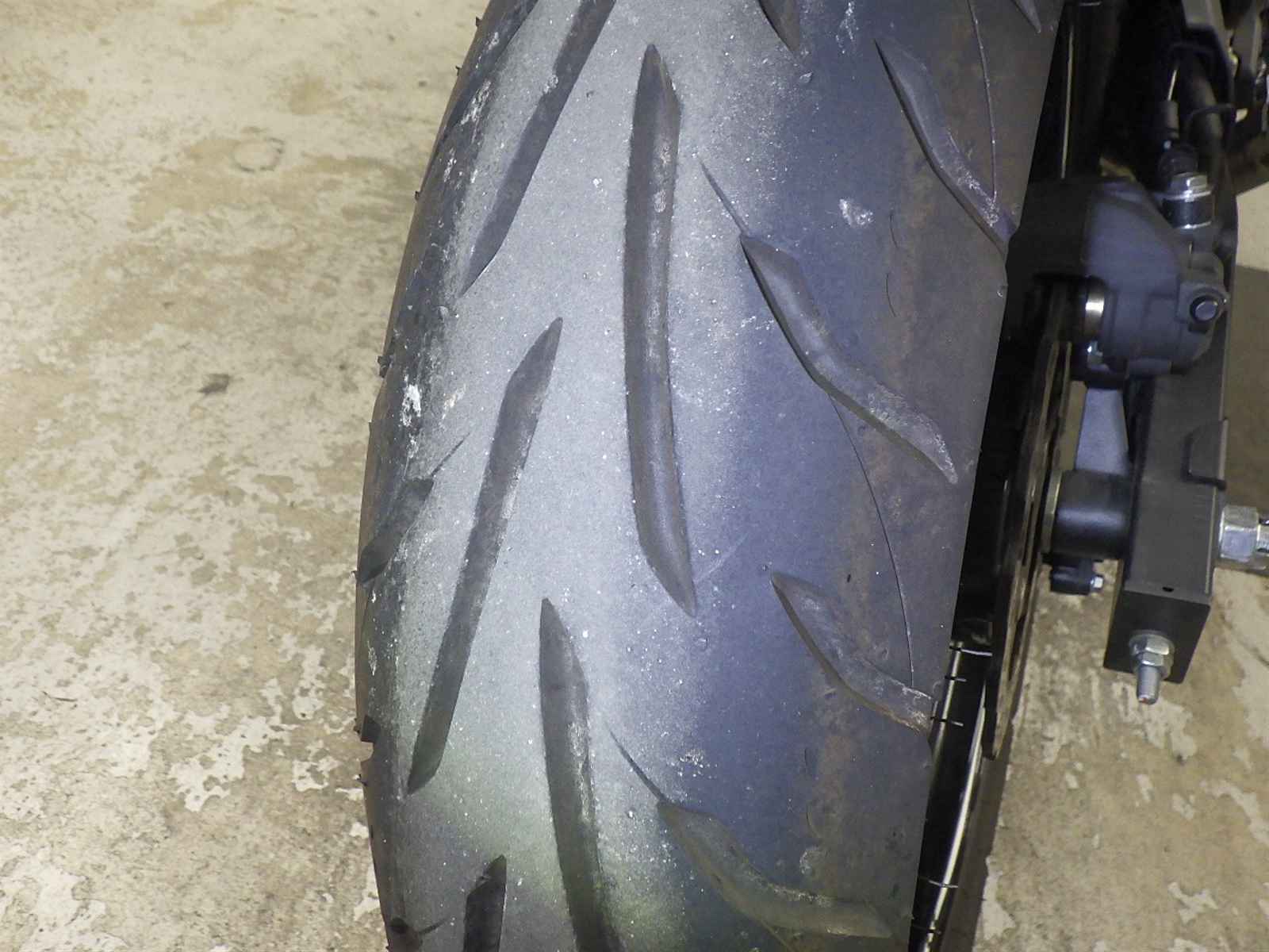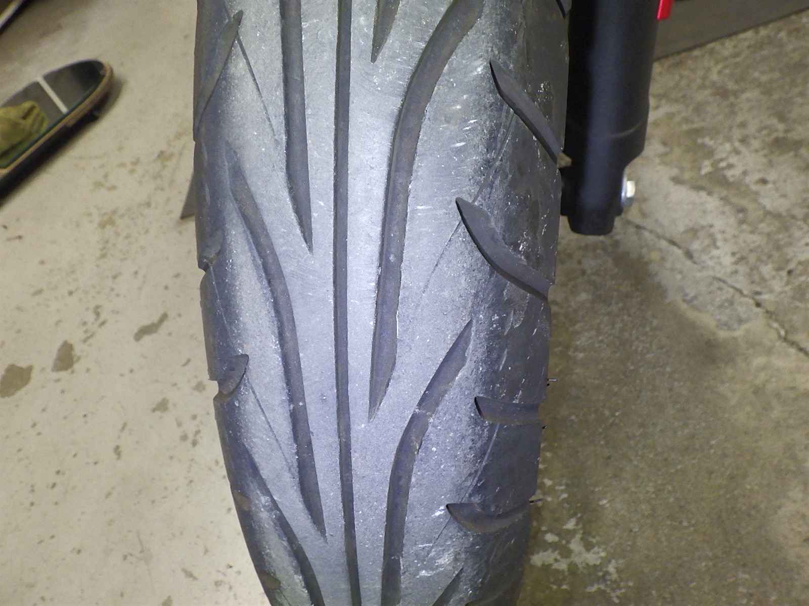 Передняя покрышка: Трещина на шине, требуется замена.