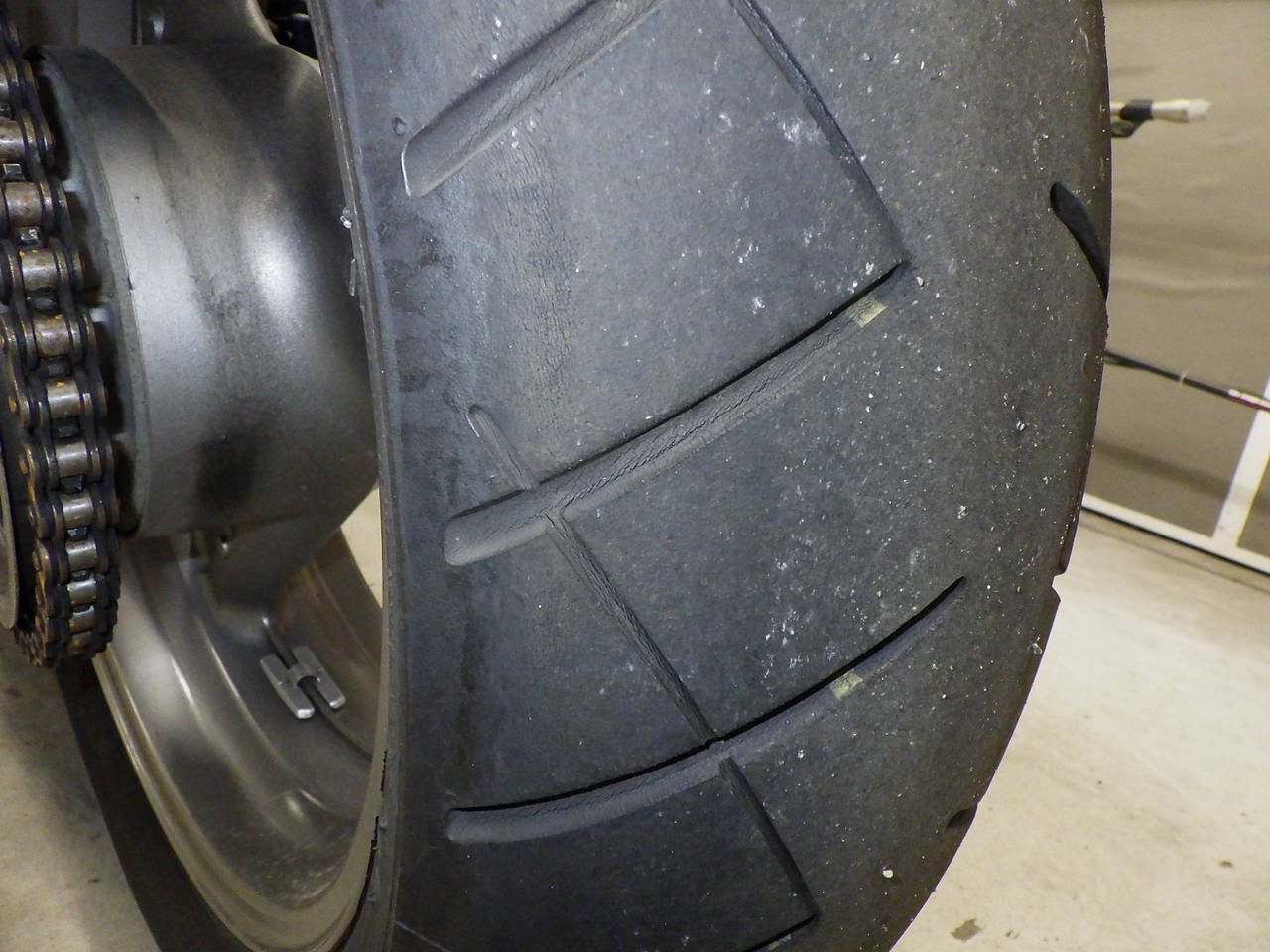 Задняя покрышка: Снижение давления в шине, Трещина требует замены.