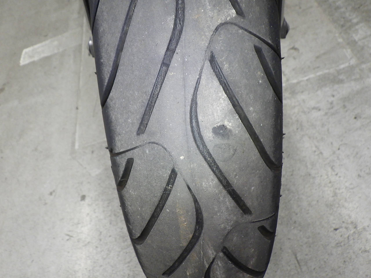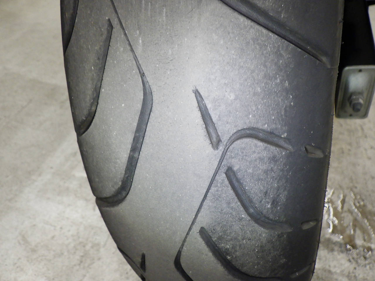 Передняя покрышка: Снижение давления в шине, Трещина требует замены.