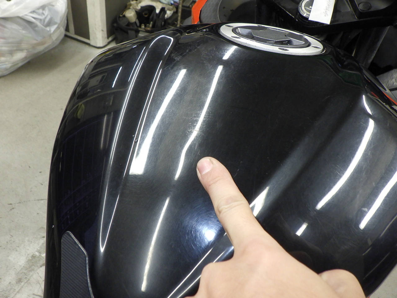 Бензобак: Недочет бака Уровень 3, Вмятина, Выцветание цвета, Установленный патч