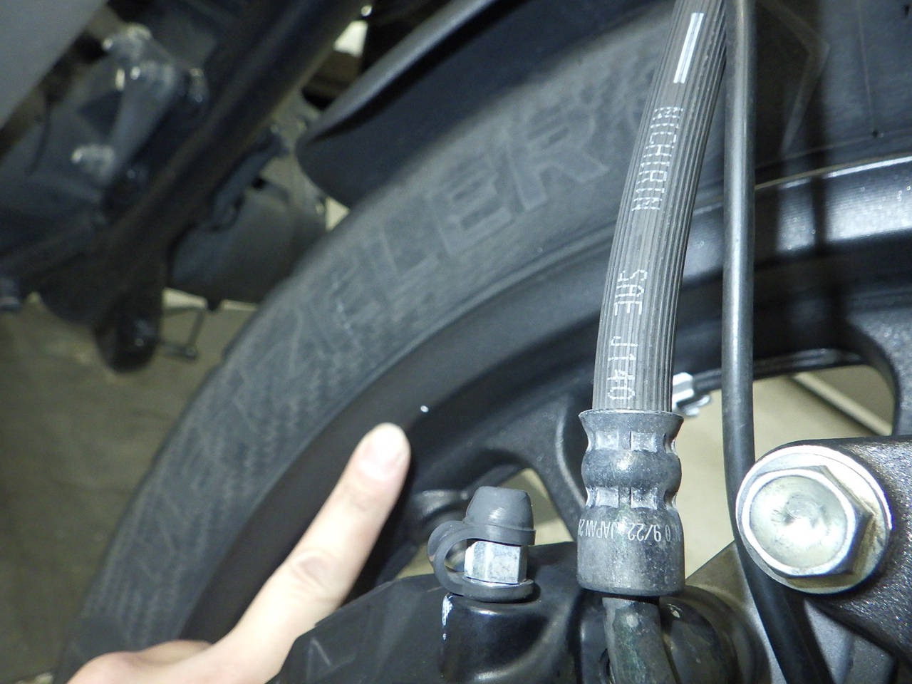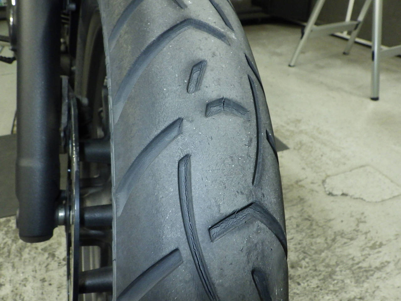 Передняя покрышка: Трещина на шине, требуется замена.