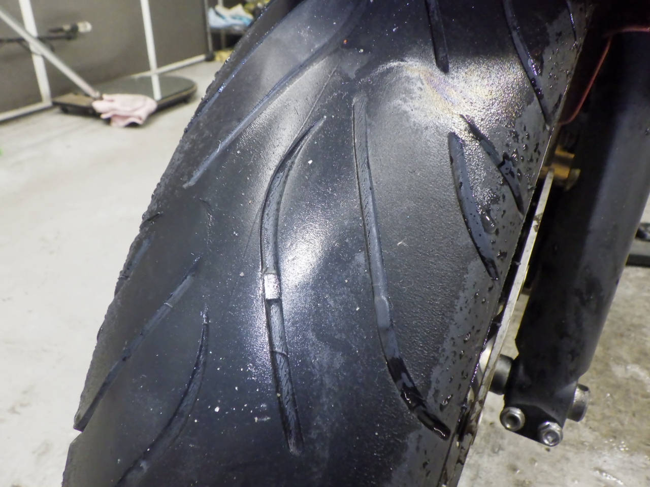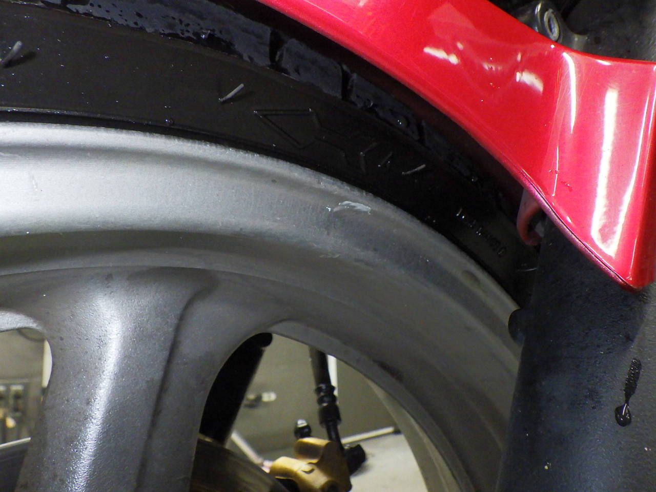 Передняя покрышка: Снижение давления в шине, Трещина требует замены.
