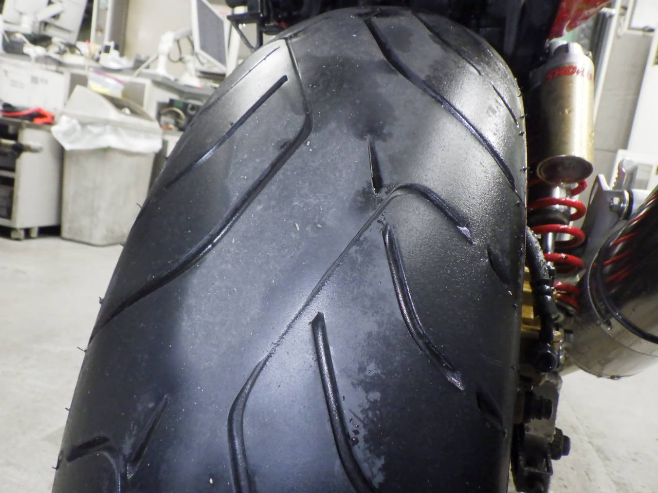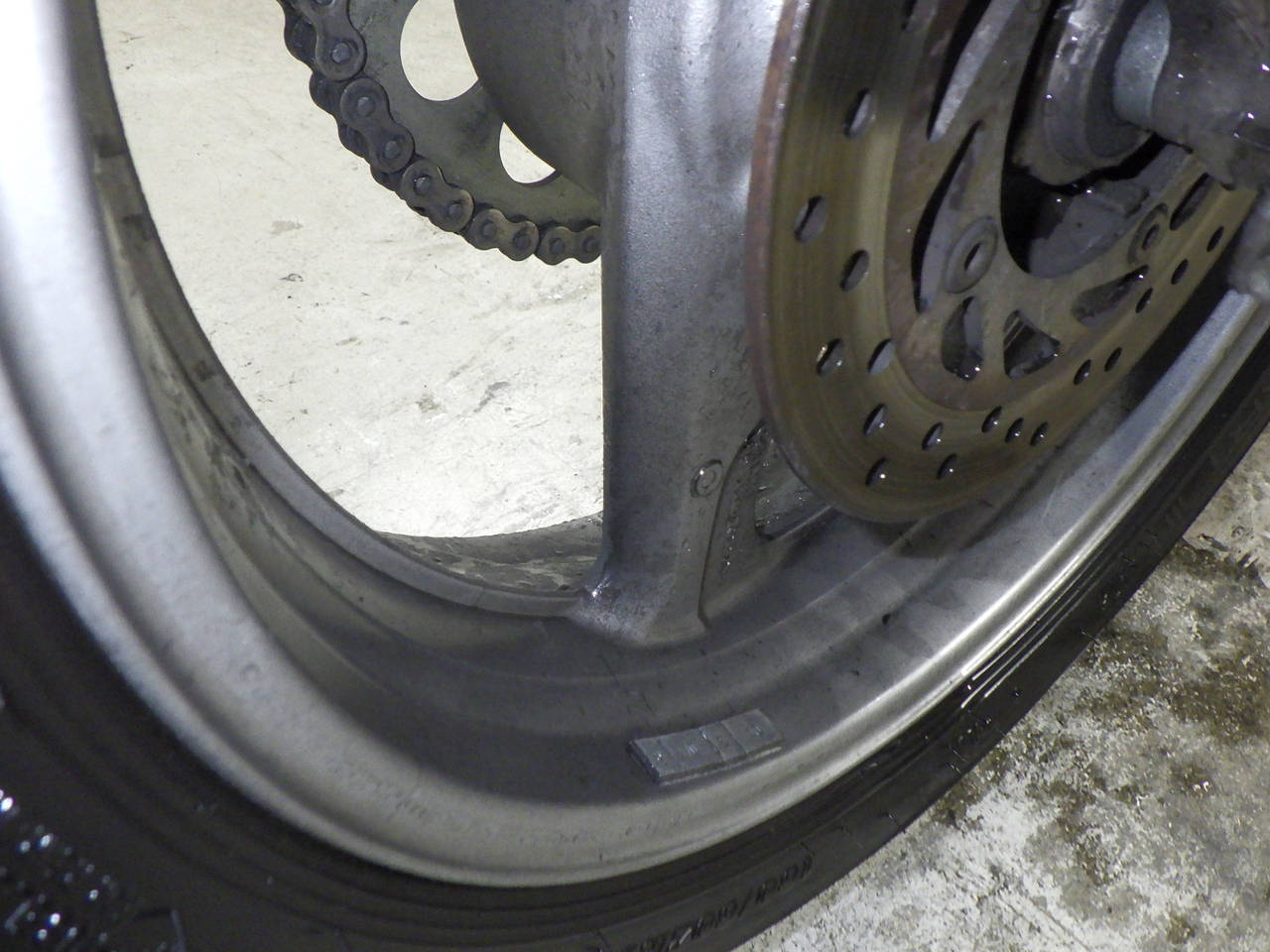 Задняя покрышка: Снижение давления в шине, Трещина требует замены.