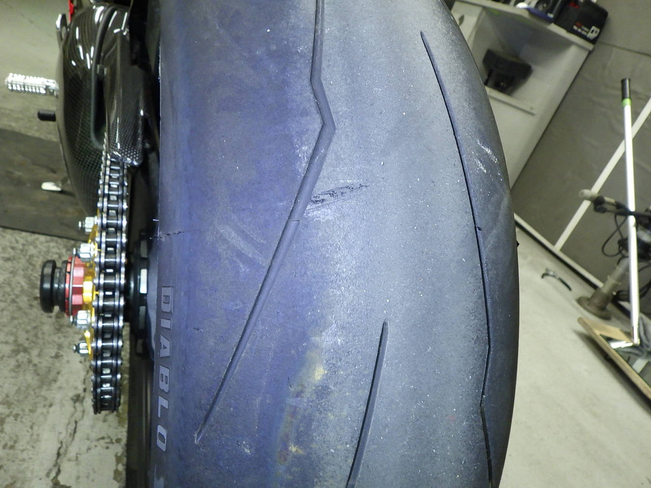 Задняя покрышка: Требуется замена изношенного шины., Таять
