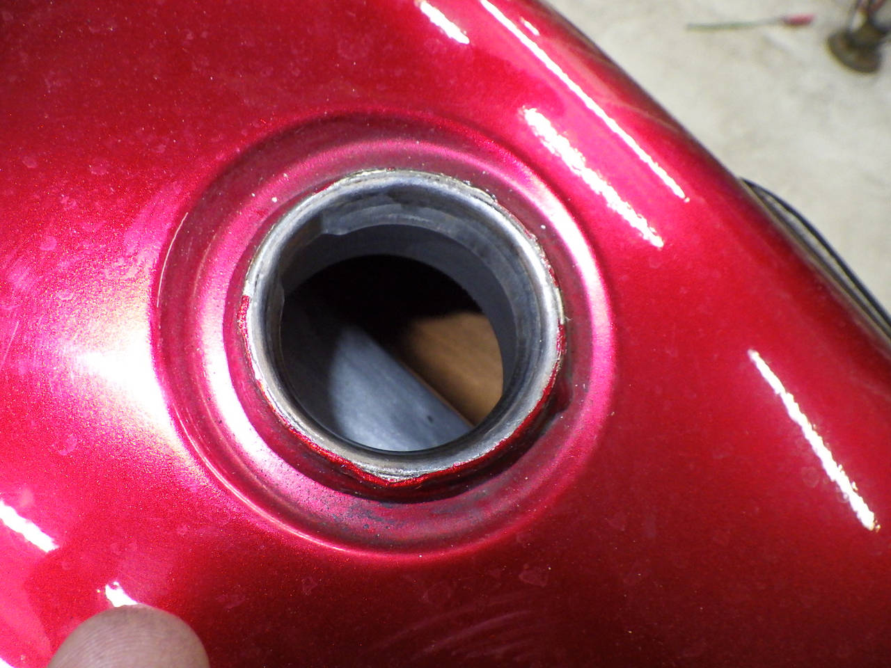 Бензобак: Повреждение бака, покраска с баллончика Неоригинальный продукт, Внутренняя полная окраска, Установленный патч, Окисление на крышке