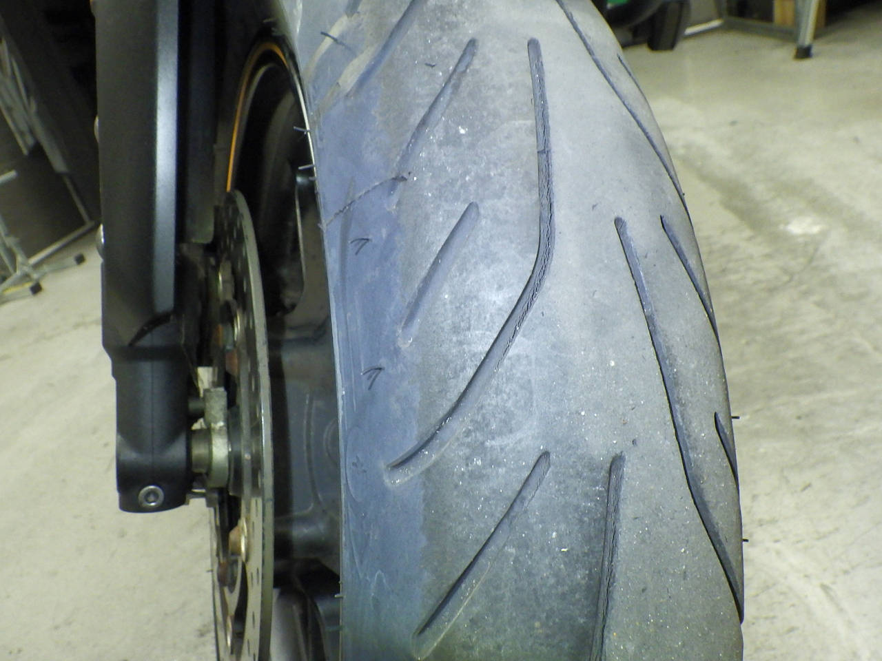 Передняя покрышка: Снижение давления в шине, Трещина требует замены.