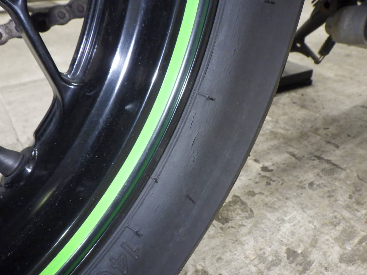 Задняя покрышка: Трещина на шине, требуется замена.