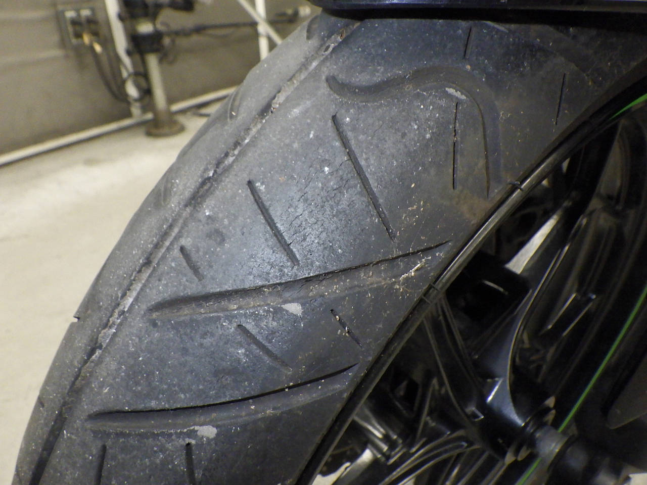 Передняя покрышка: Трещина на шине, требуется замена.
