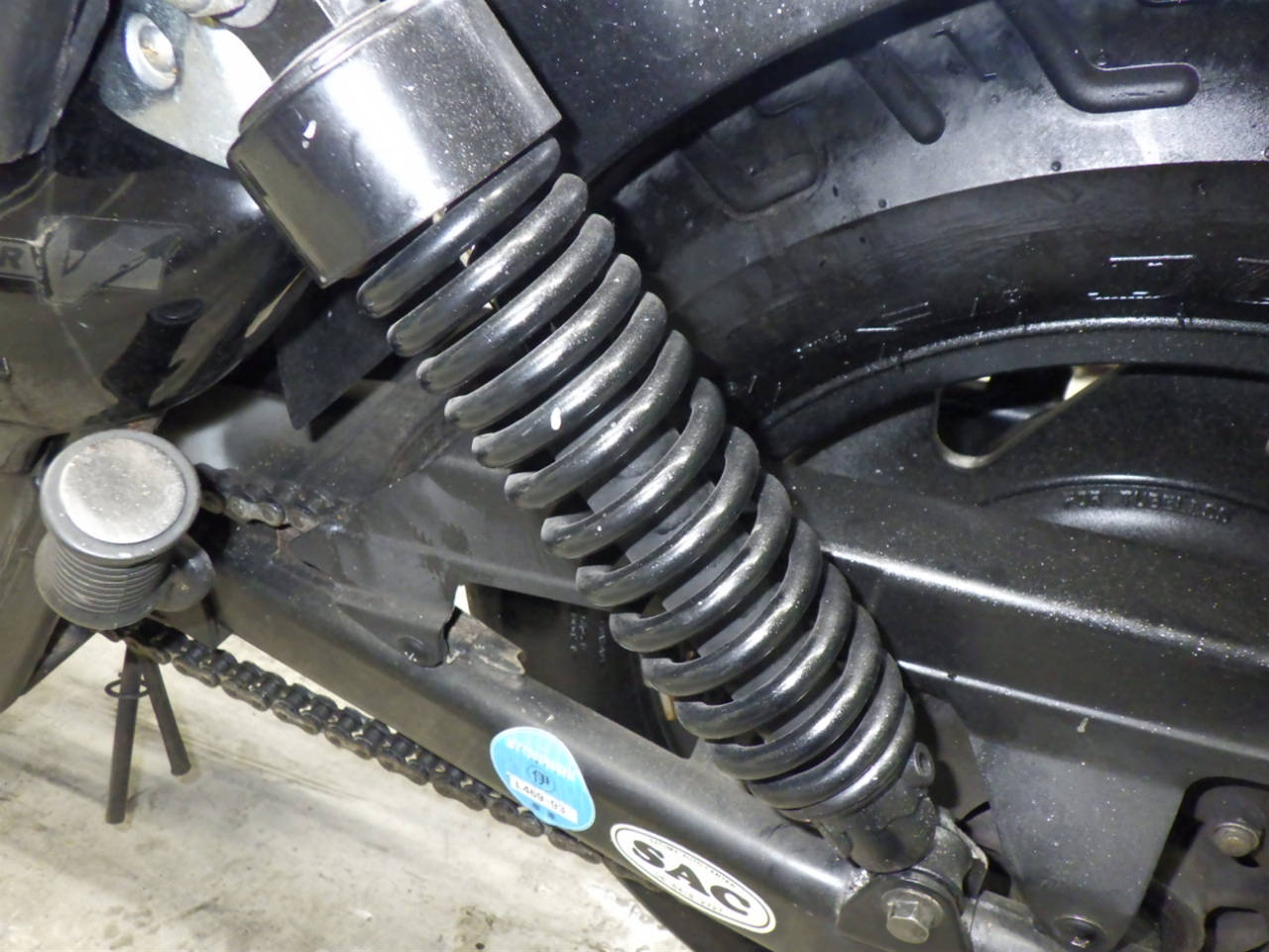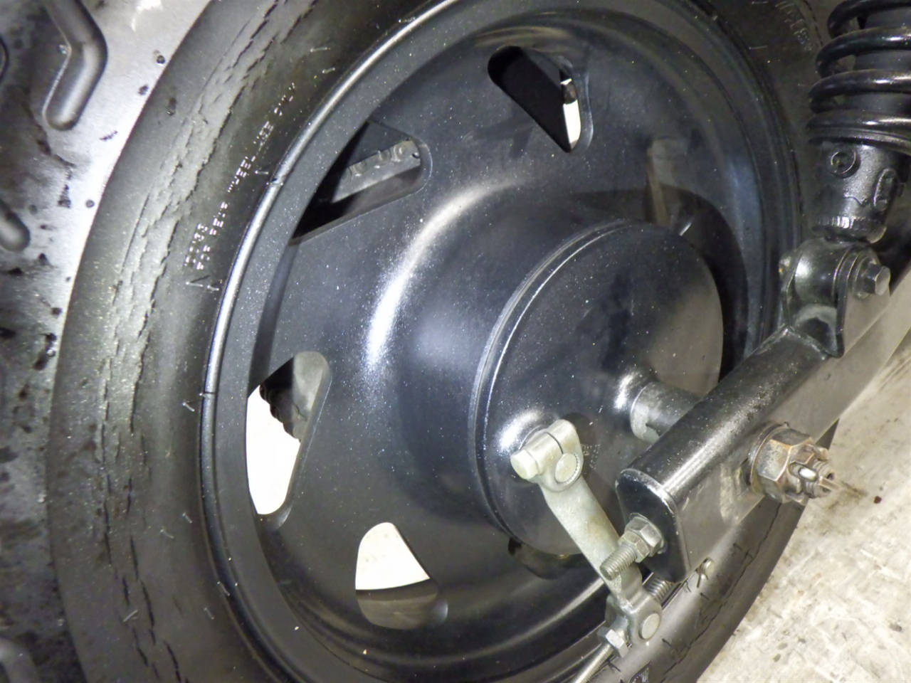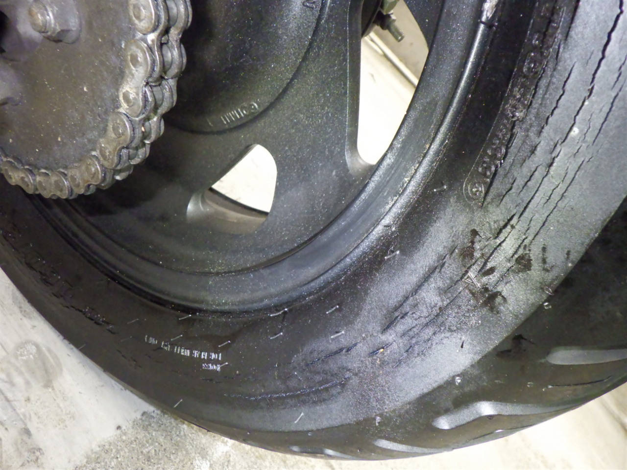 Задняя покрышка: Трещина на шине, требуется замена.