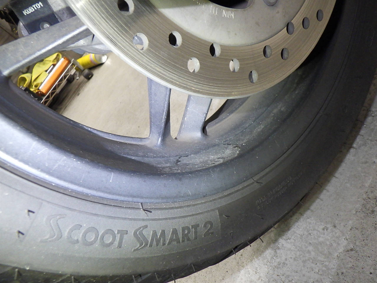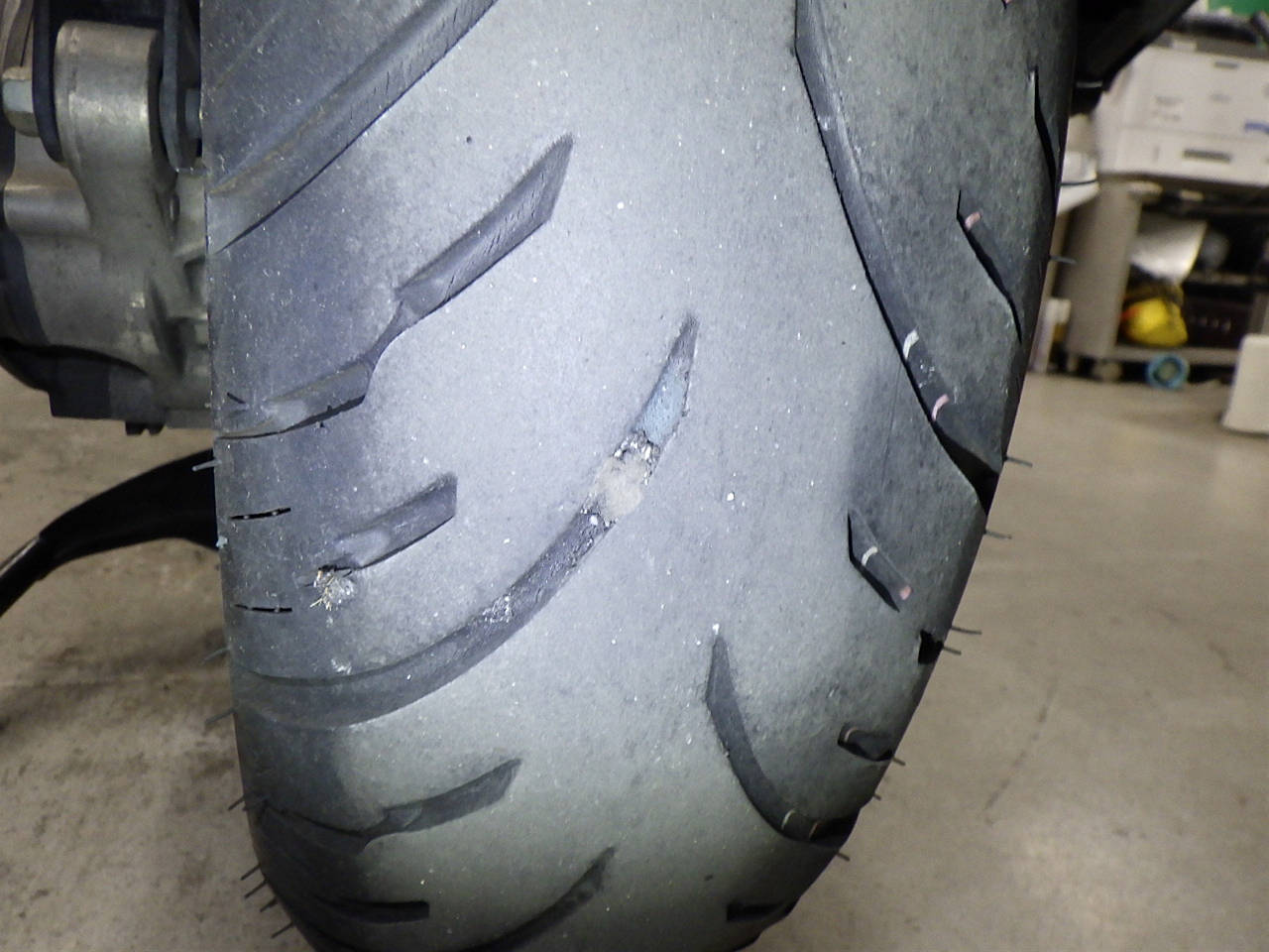Задняя покрышка: Требуется замена изношенного шины., Повреждение границы.