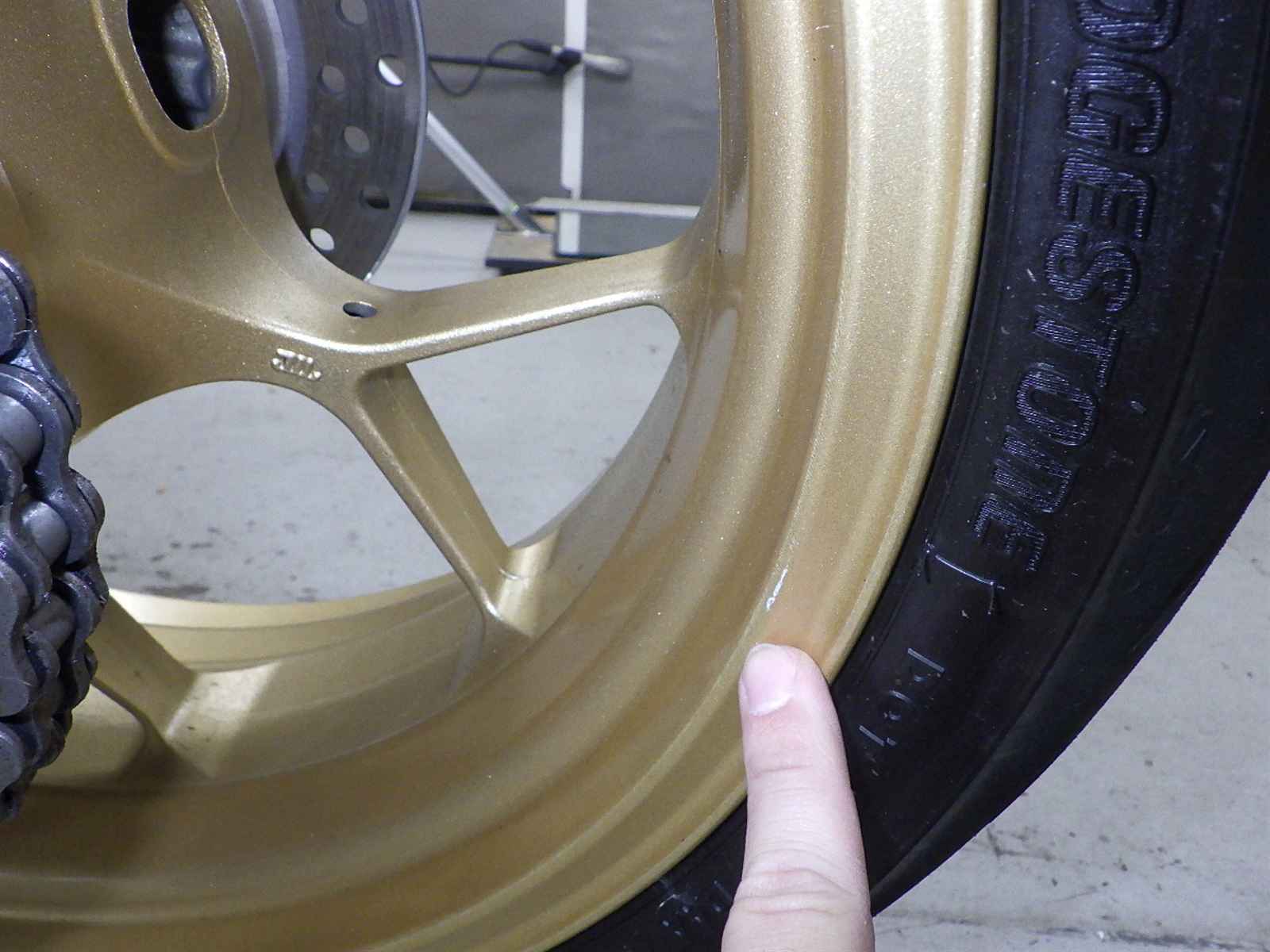 Заднее колесо: Недочет колеса, краска облупилась