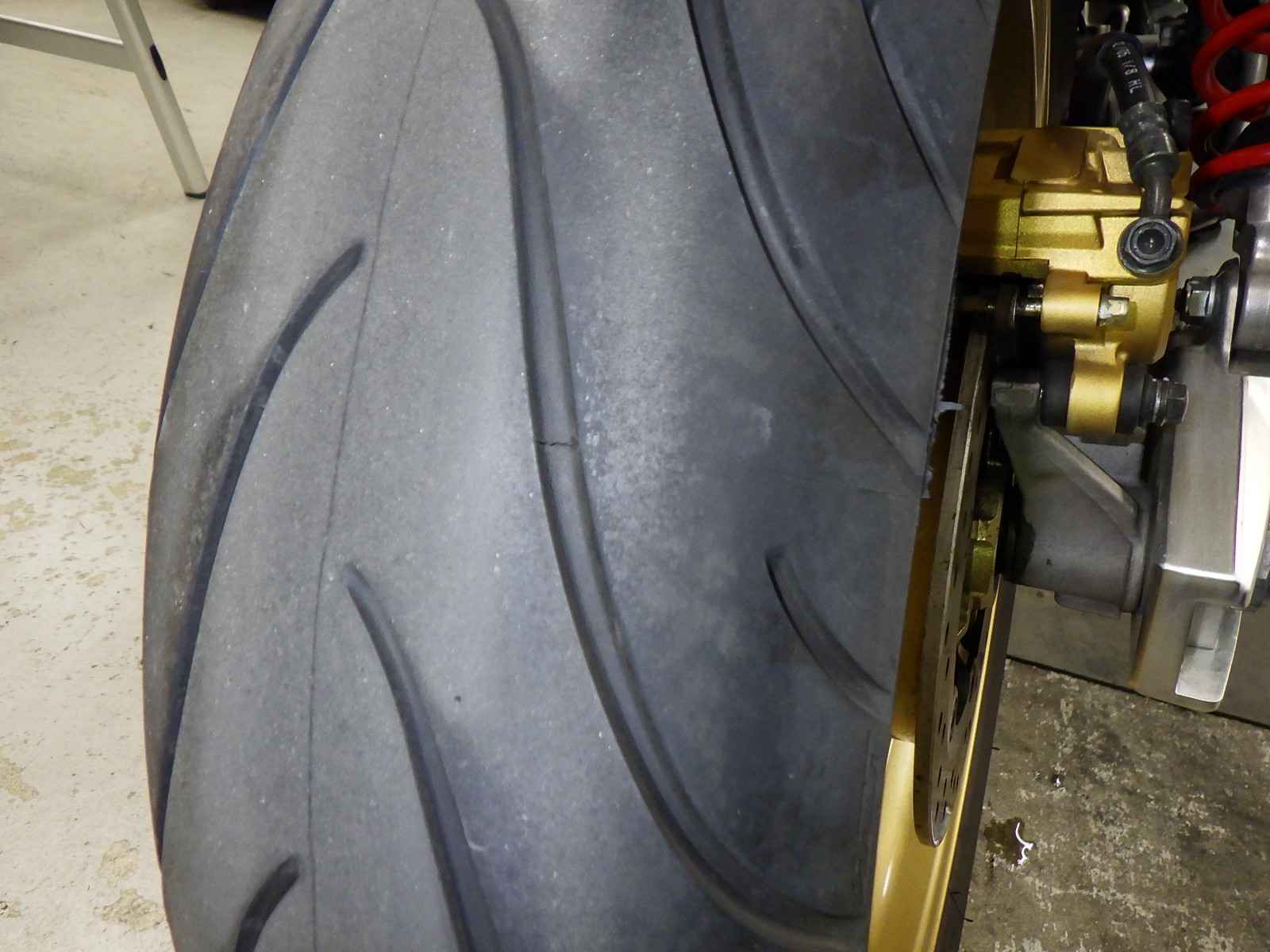 Передняя покрышка: Снижение давления в шине, Трещина требует замены.
