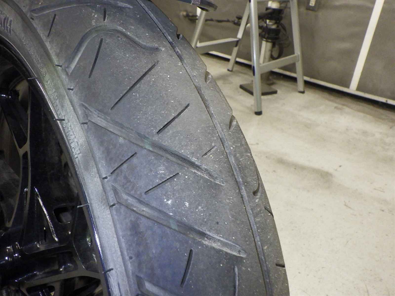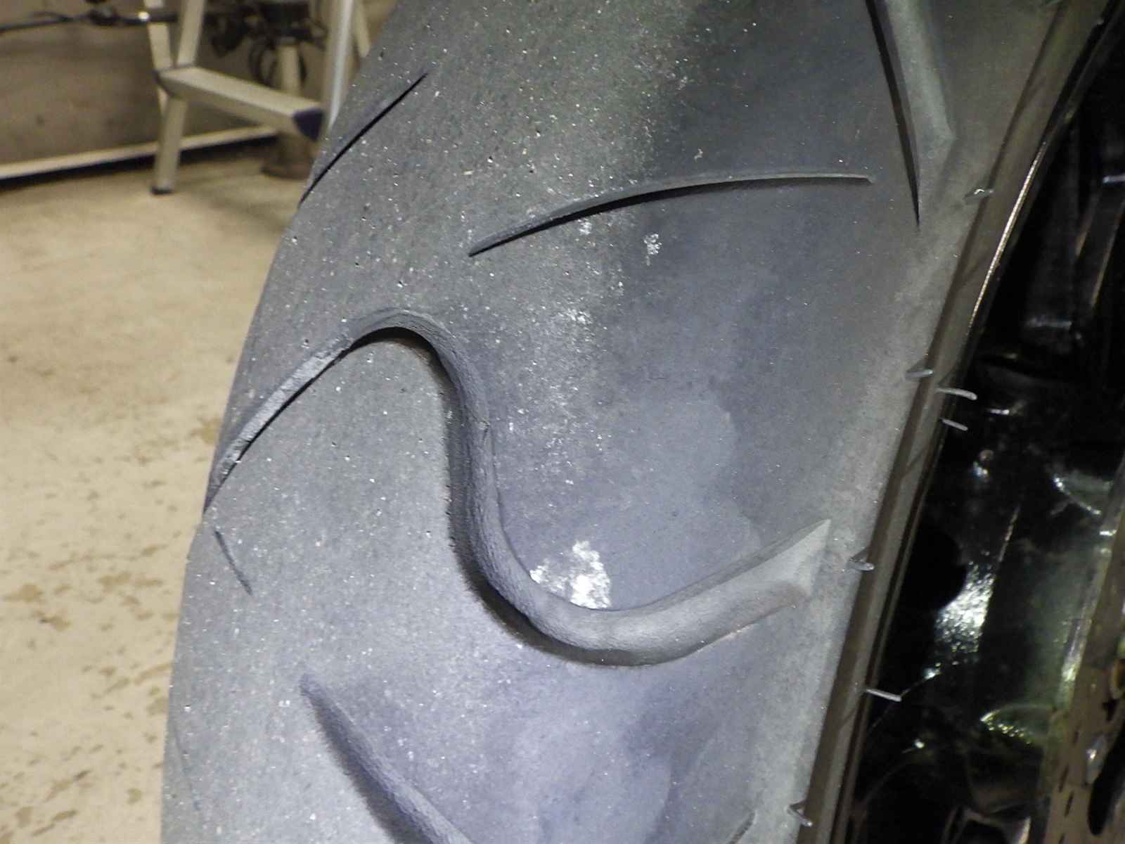 Передняя покрышка: Снижение давления в шине, Трещина требует замены.