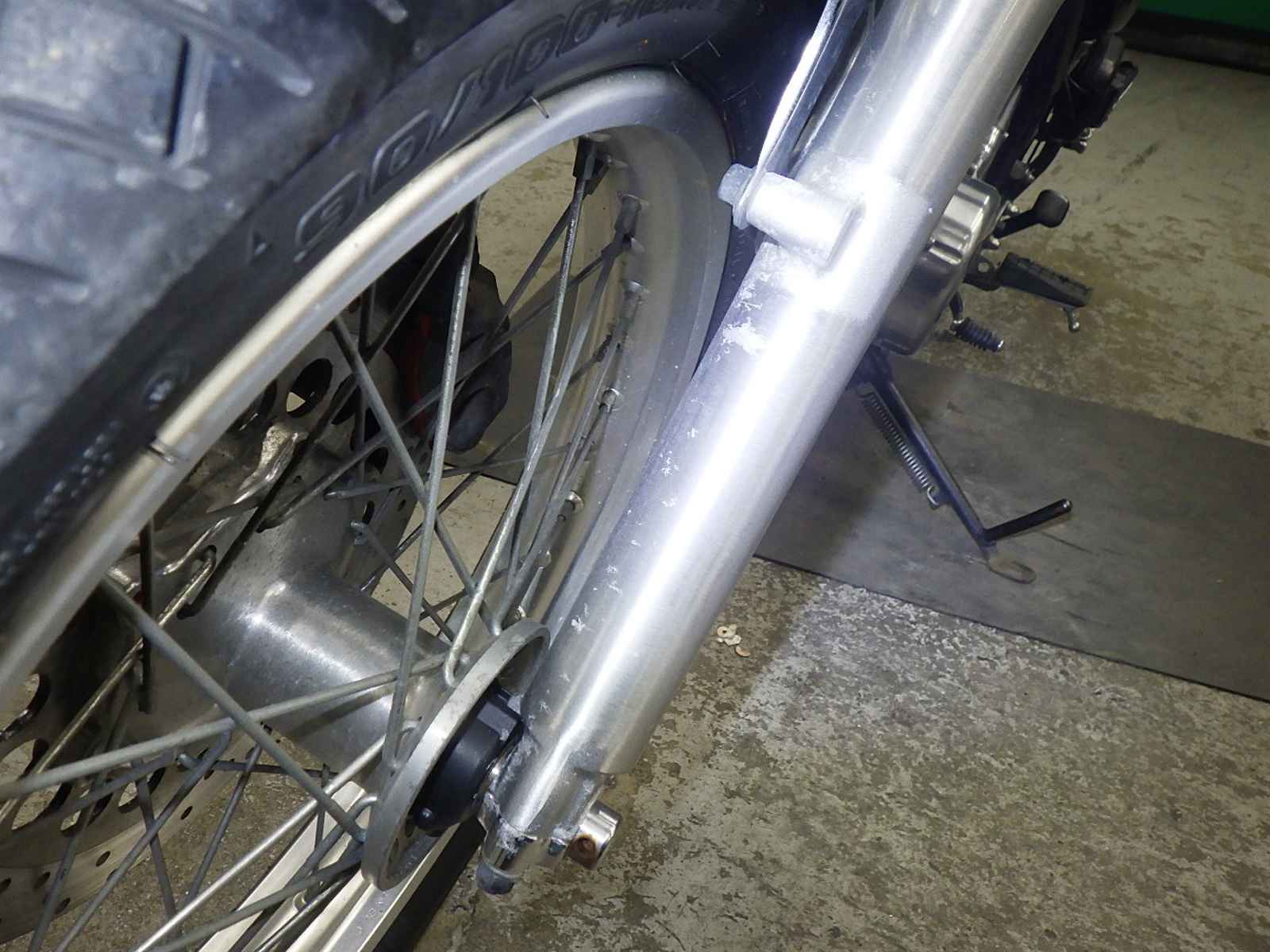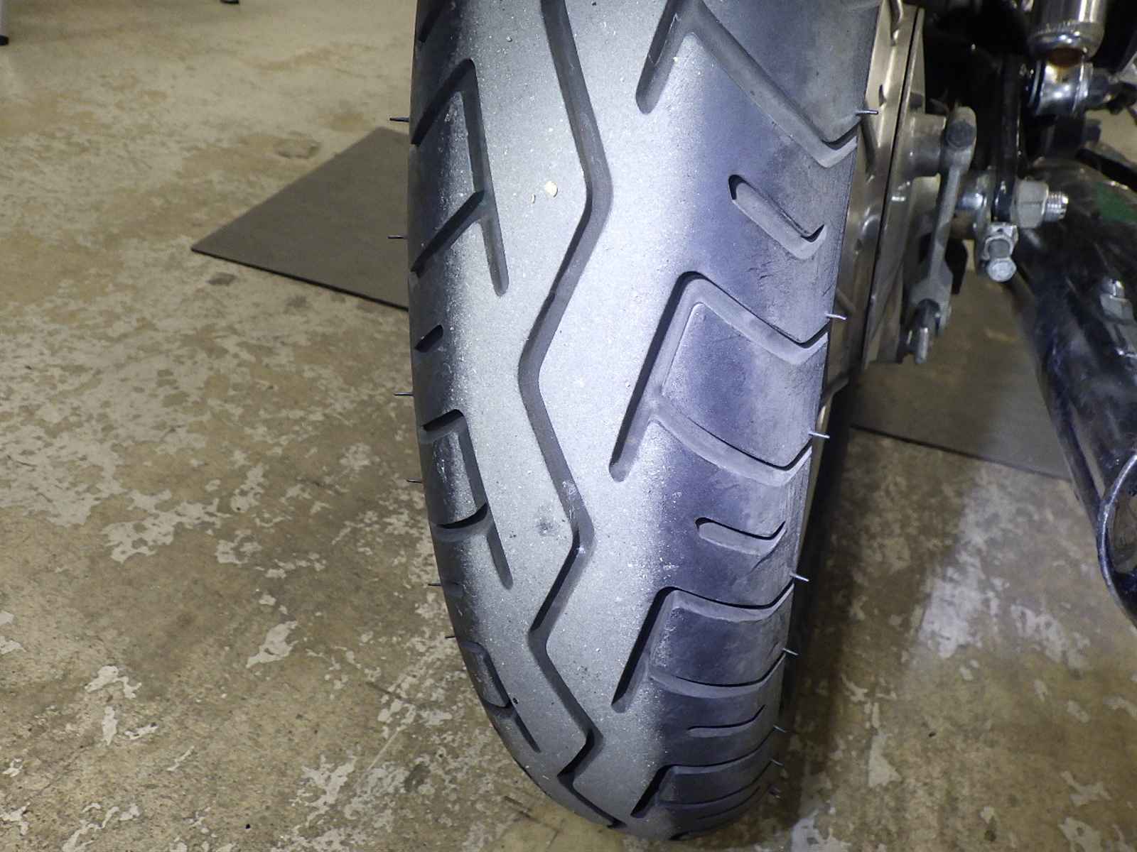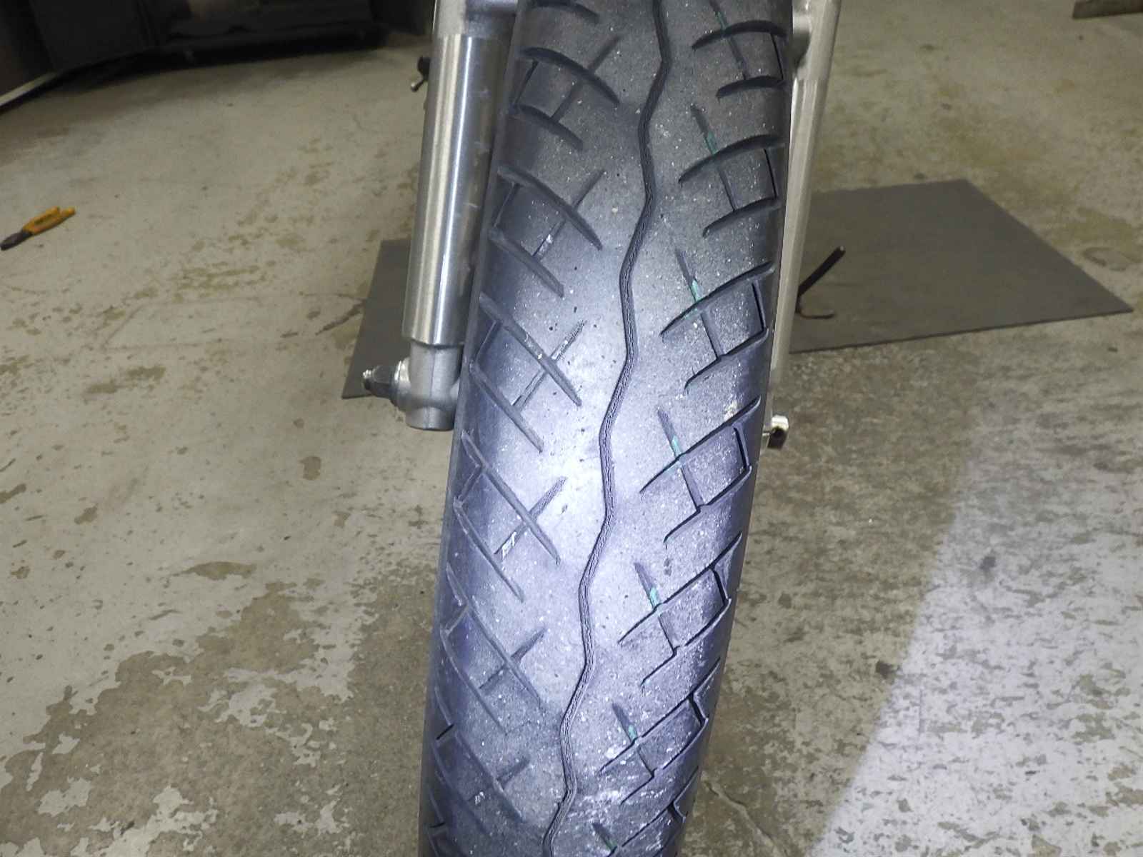 Передняя покрышка: Снижение давления в шине, Трещина требует замены.