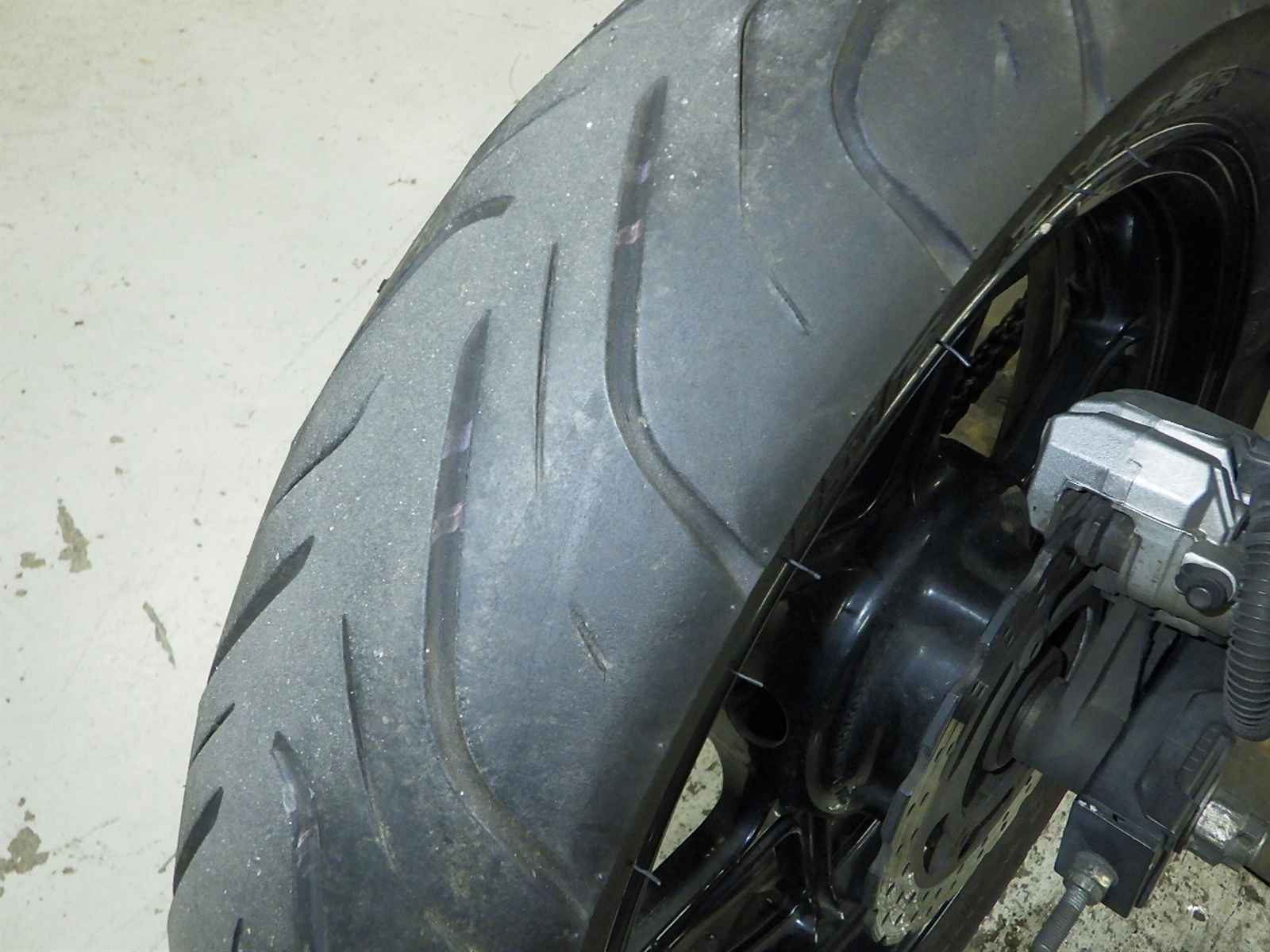 Задняя покрышка: Трещина на шине, требуется замена.