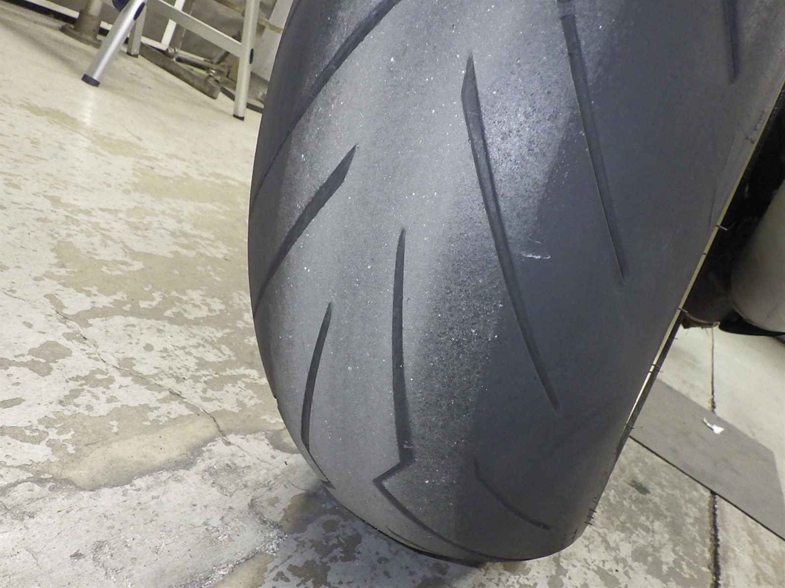 Передняя покрышка: Снижение давления в шине, Трещина требует замены.