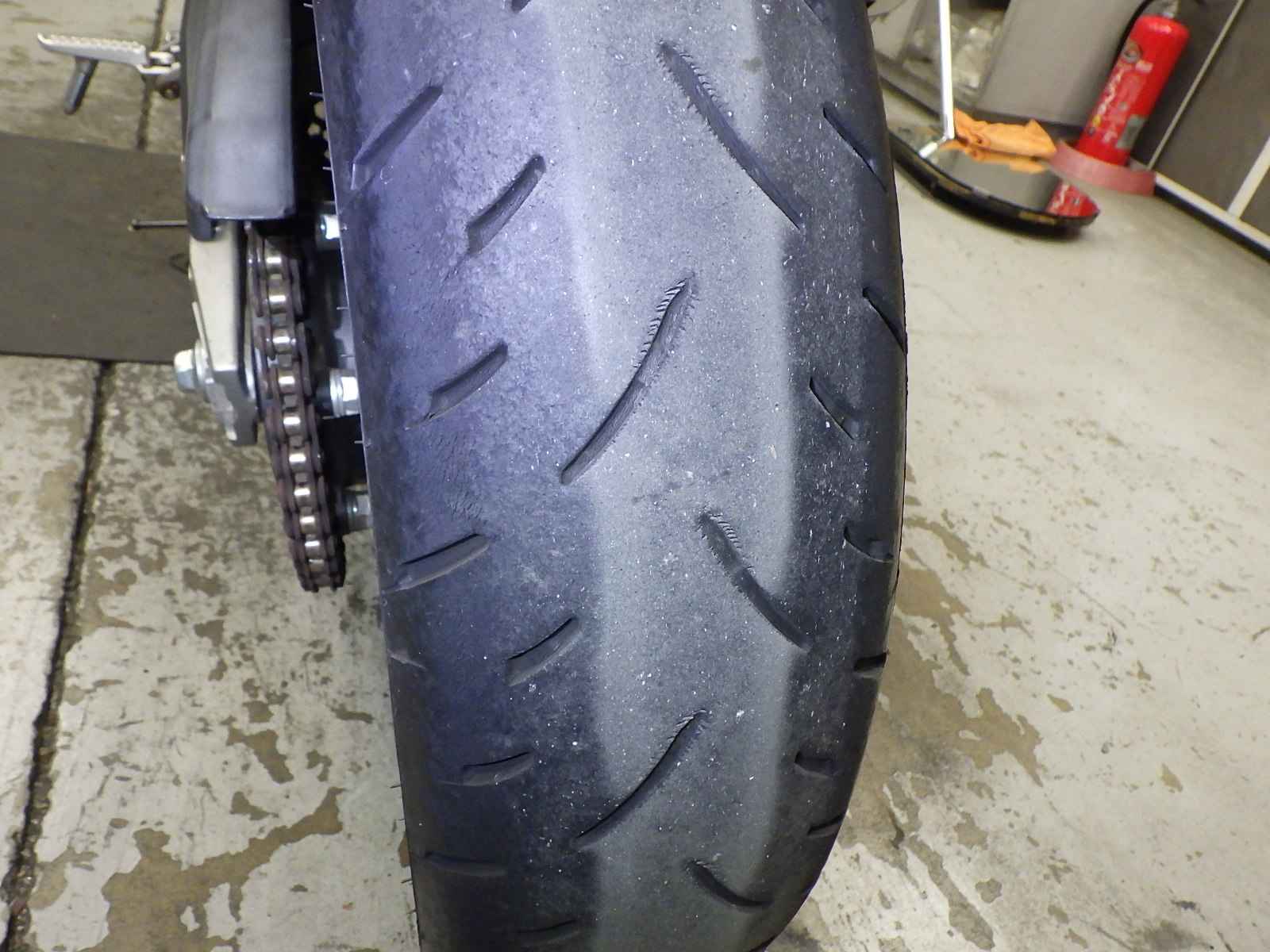 Задняя покрышка: Снижение давления в шине, Трещина требует замены.