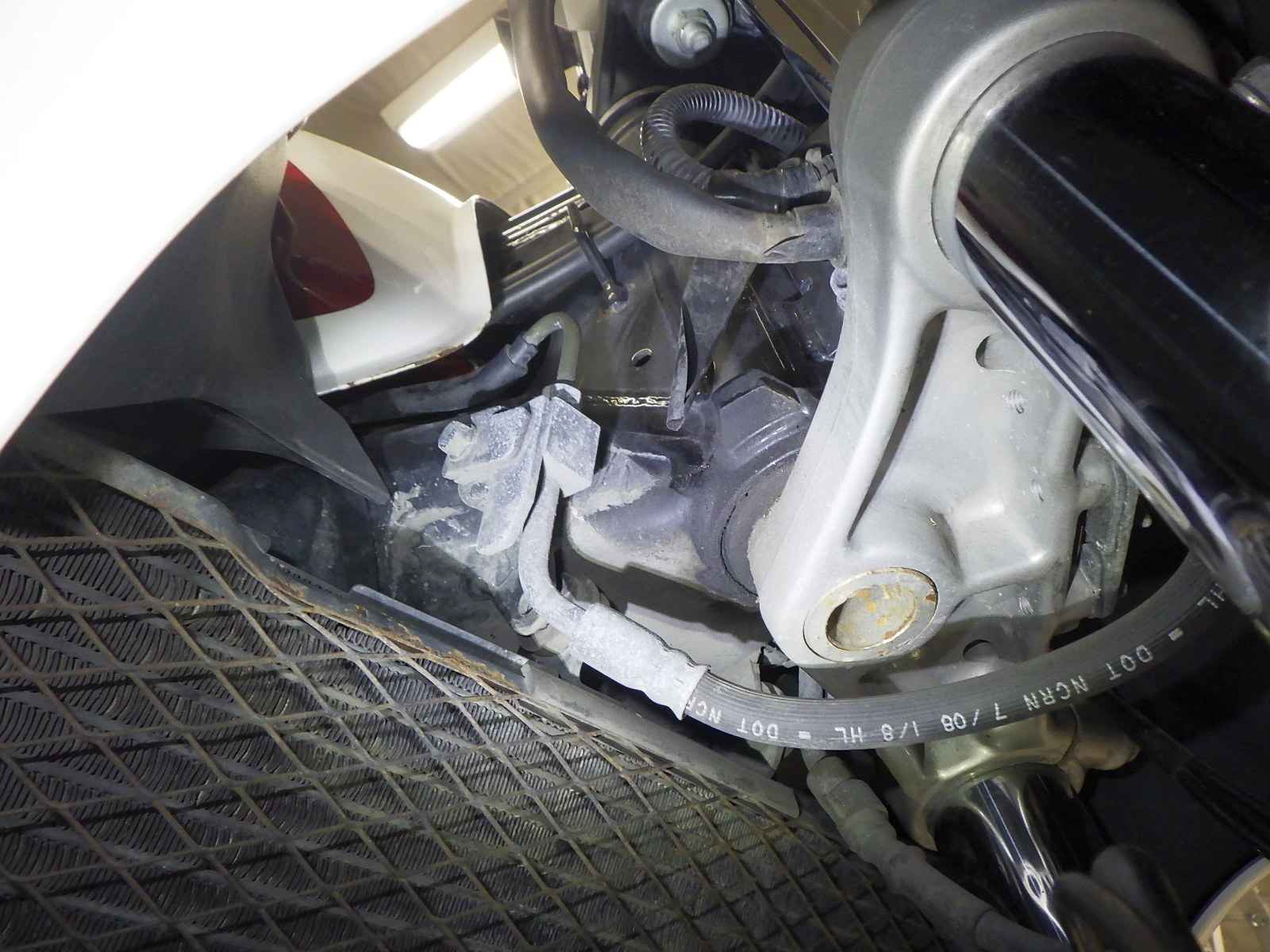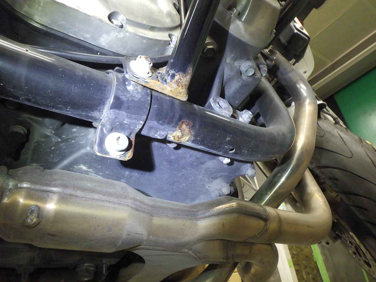 クーラント漏れ小。エンジンガード付きキズ多、サビ。各所キズ、サビ多、変色。