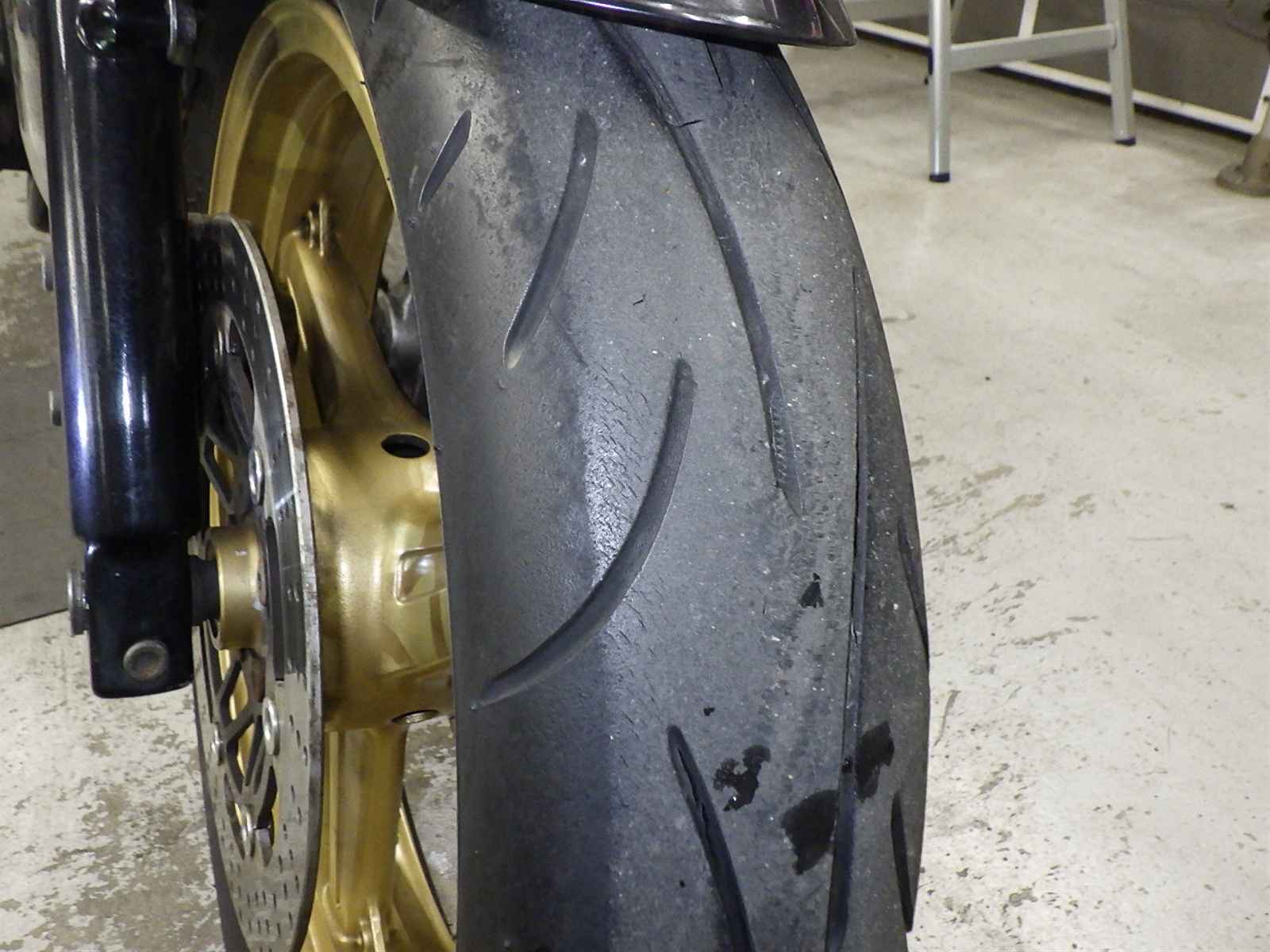 Передняя покрышка: Снижение давления в шине, Трещина требует замены.