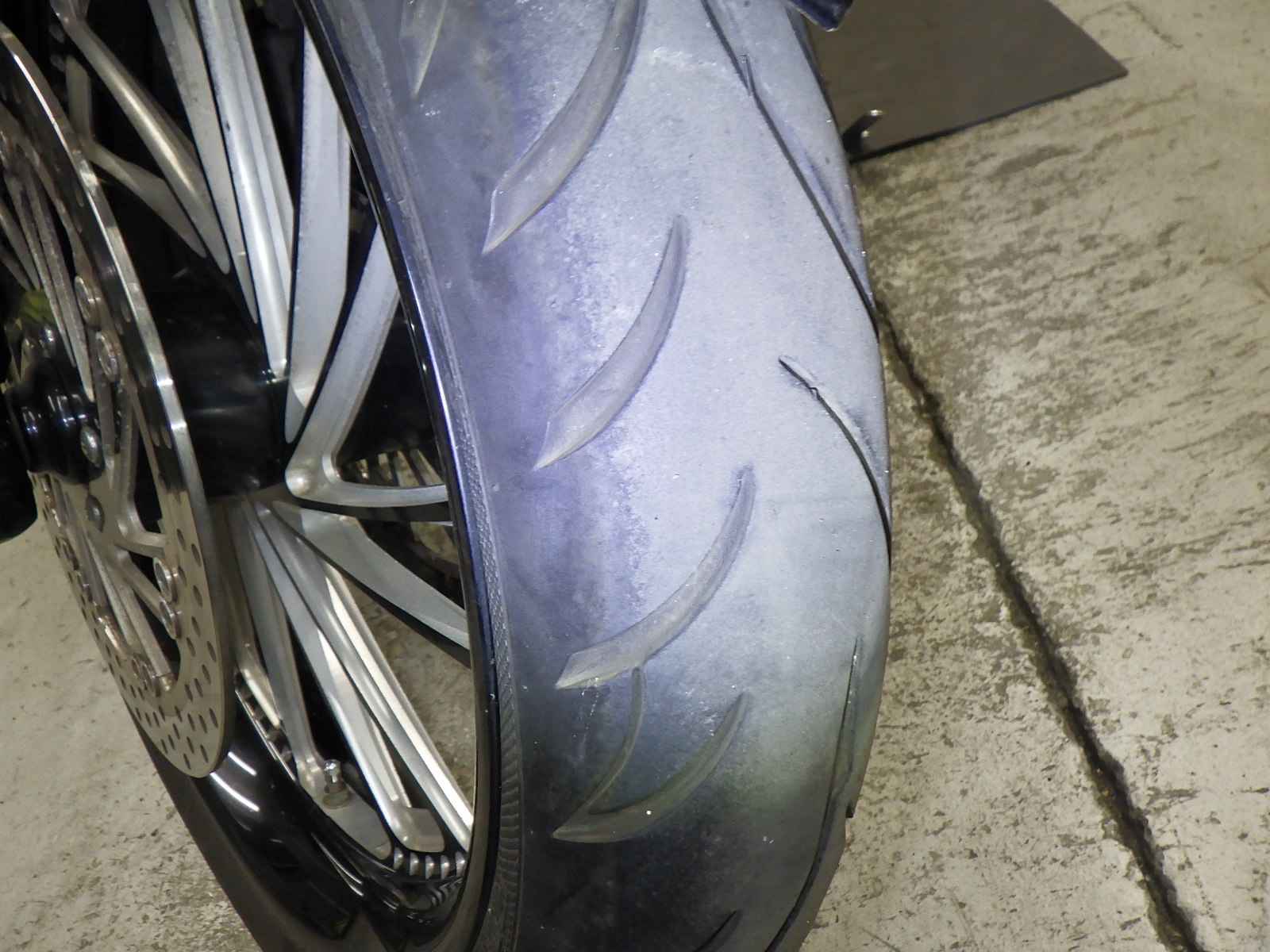 Передняя покрышка: Трещина на шине, требуется замена.