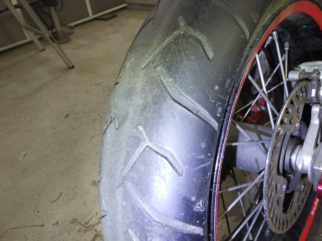 Задняя покрышка: Снижение давления в шине, Трещина требует замены.