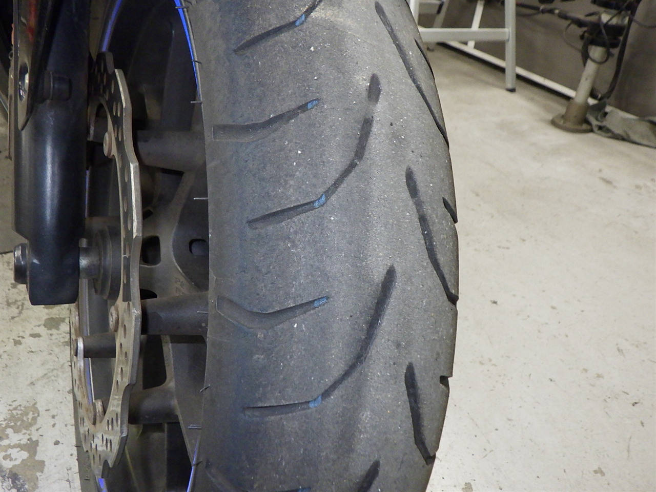 Передняя покрышка: Снижение давления в шине, Трещина требует замены.