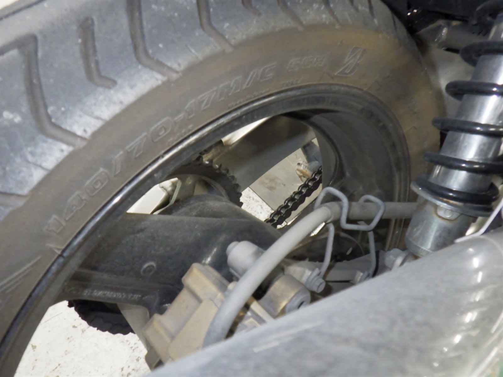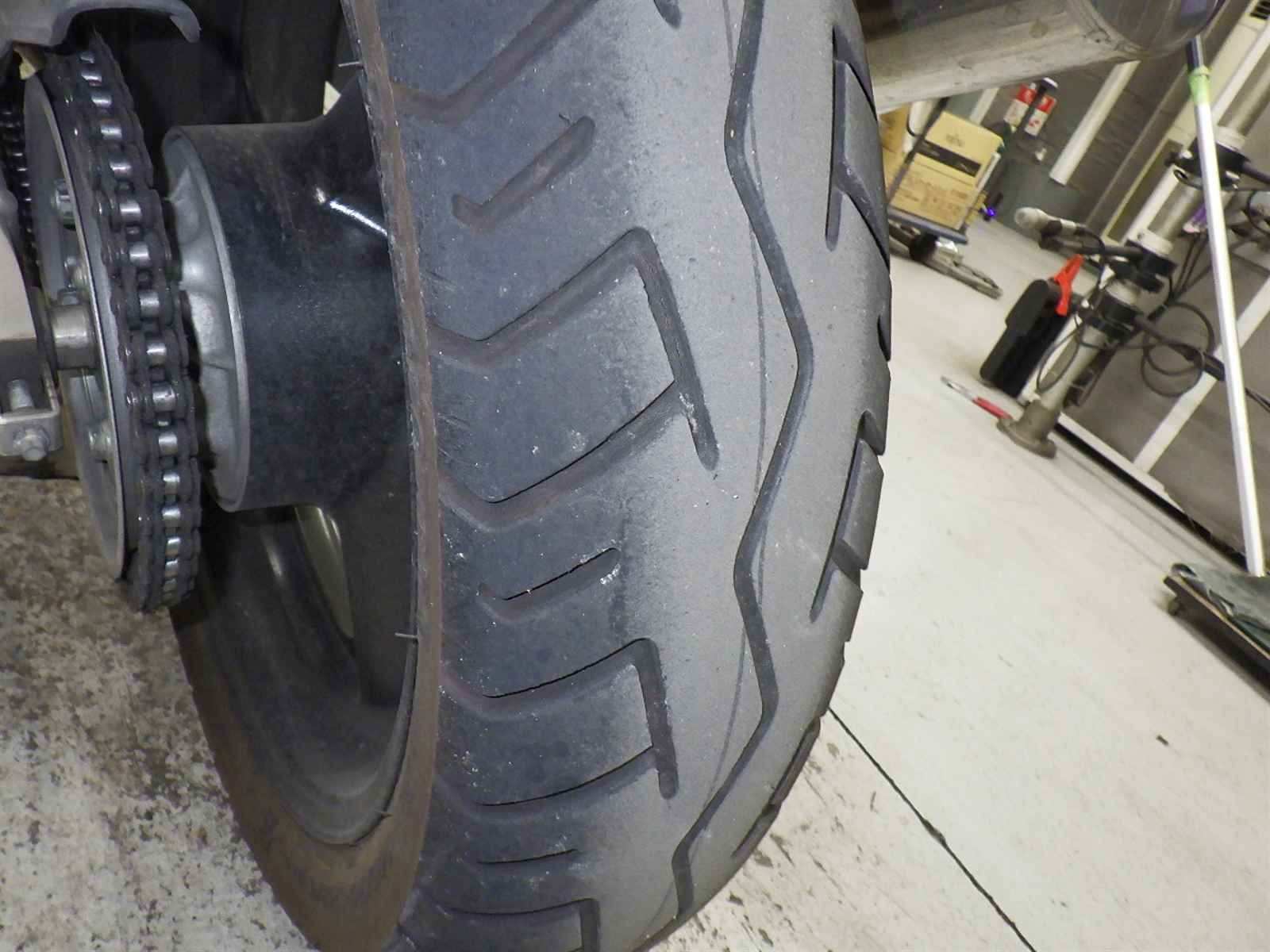 Задняя покрышка: Снижение давления в шине, Трещина требует замены.