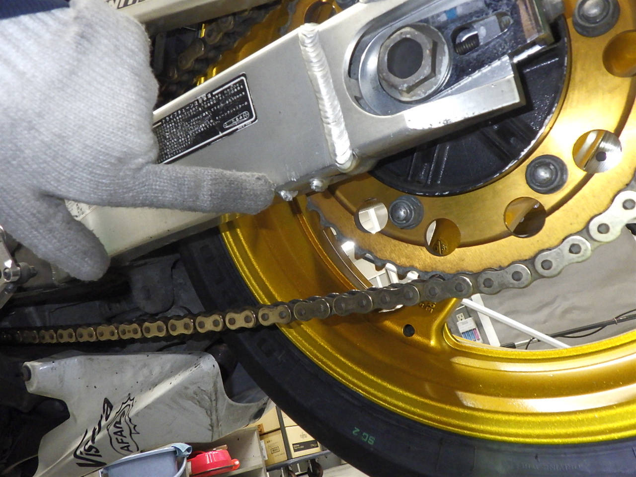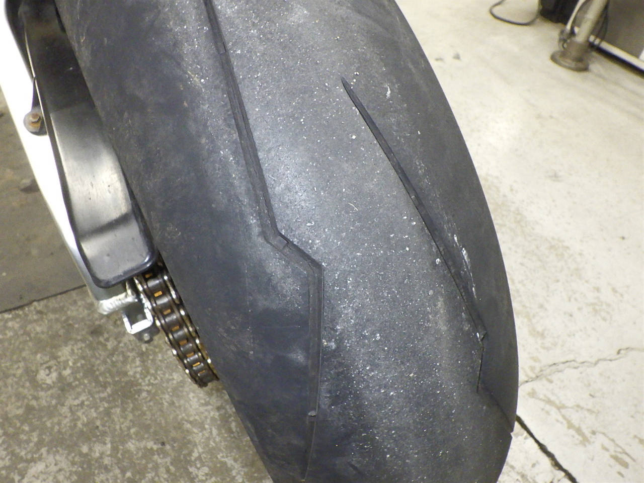 Задняя покрышка: Снижение давления в шине, Трещина требует замены.