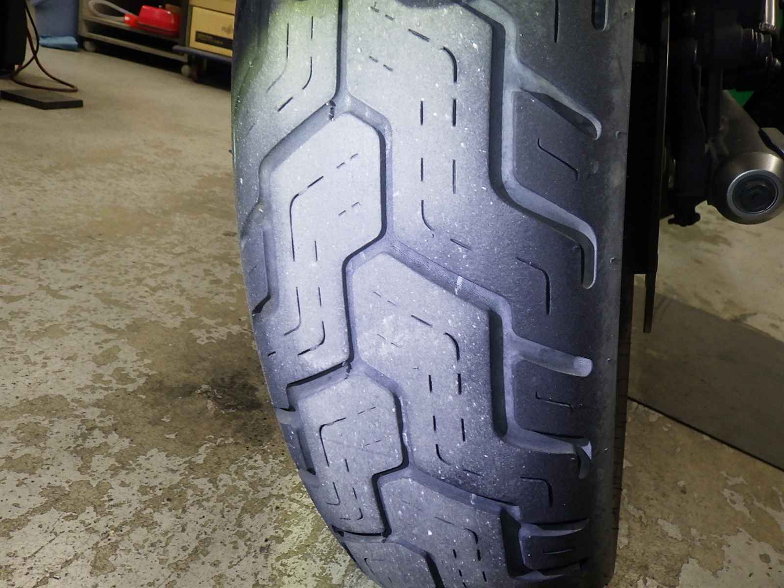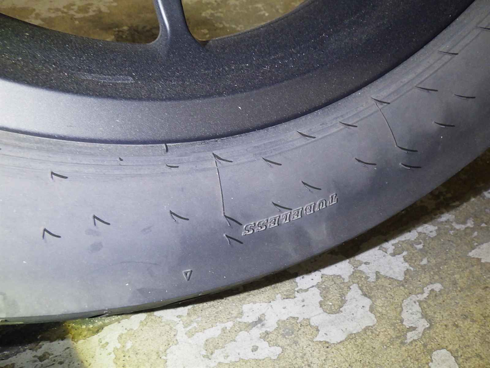 Передняя покрышка: Снижение давления в шине, Трещина требует замены.
