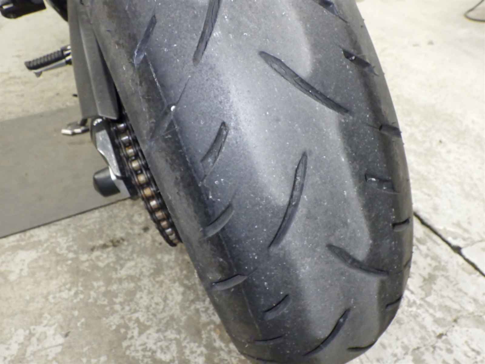 Задняя покрышка: Трещина на шине, требуется замена.