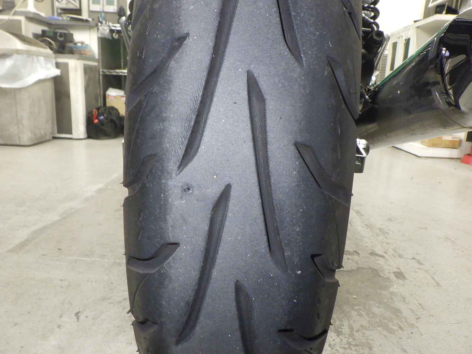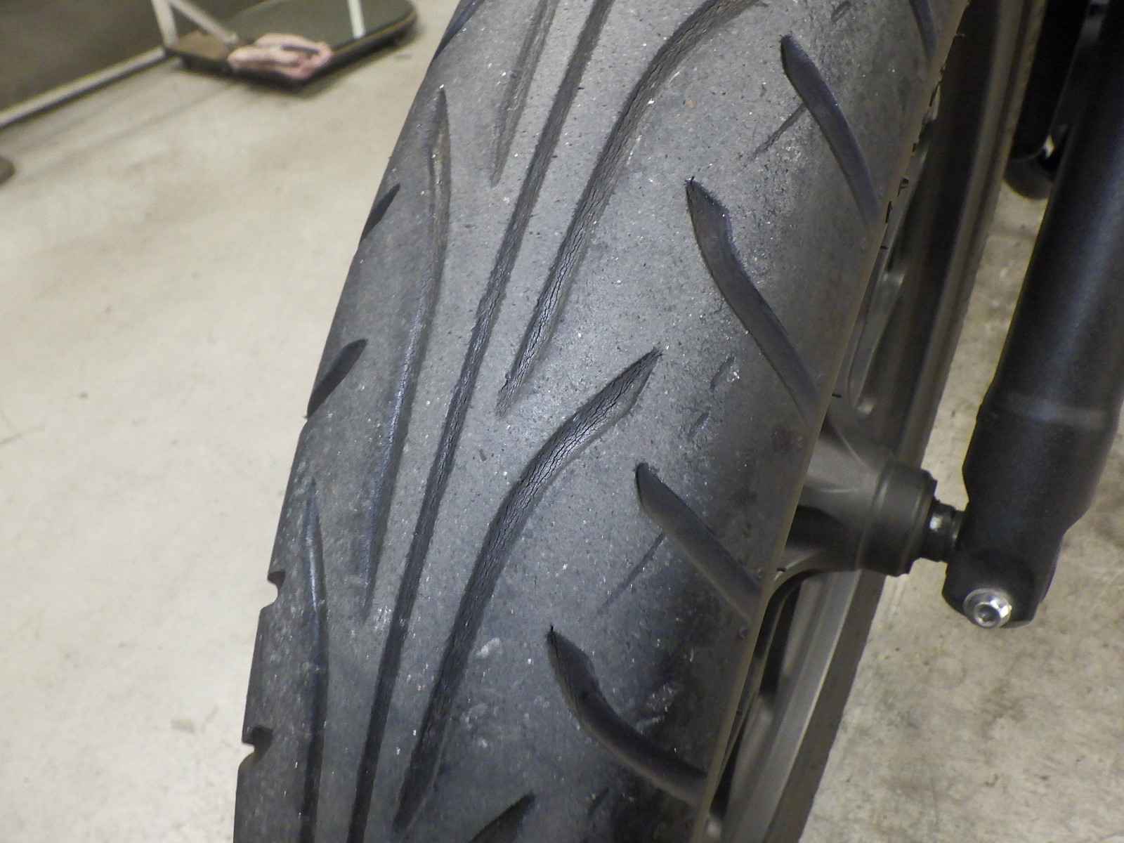 Передняя покрышка: Снижение давления в шине, Трещина требует замены.