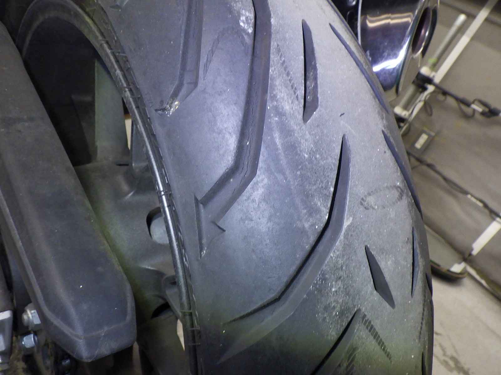 Задняя покрышка: Трещина на шине, требуется замена.