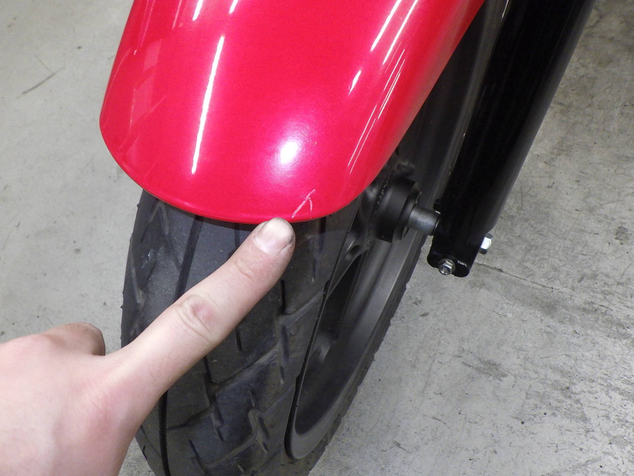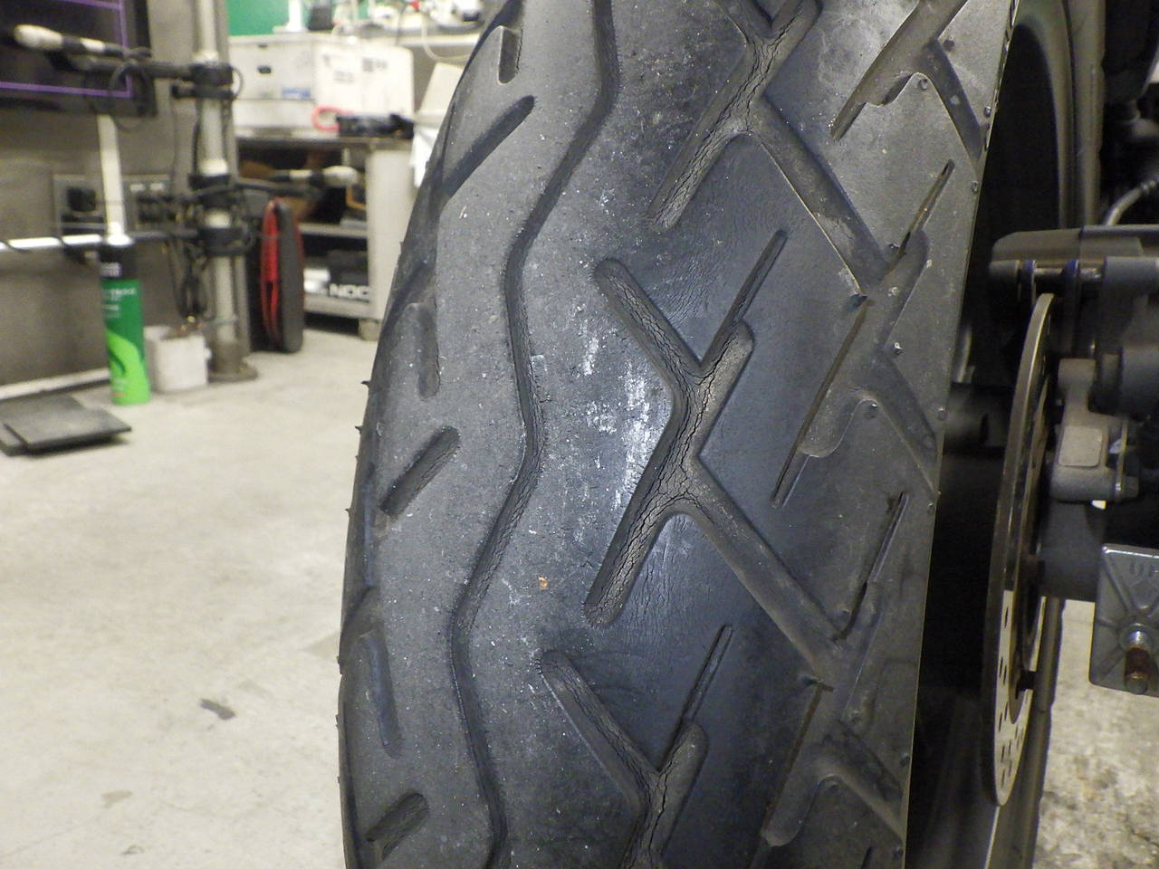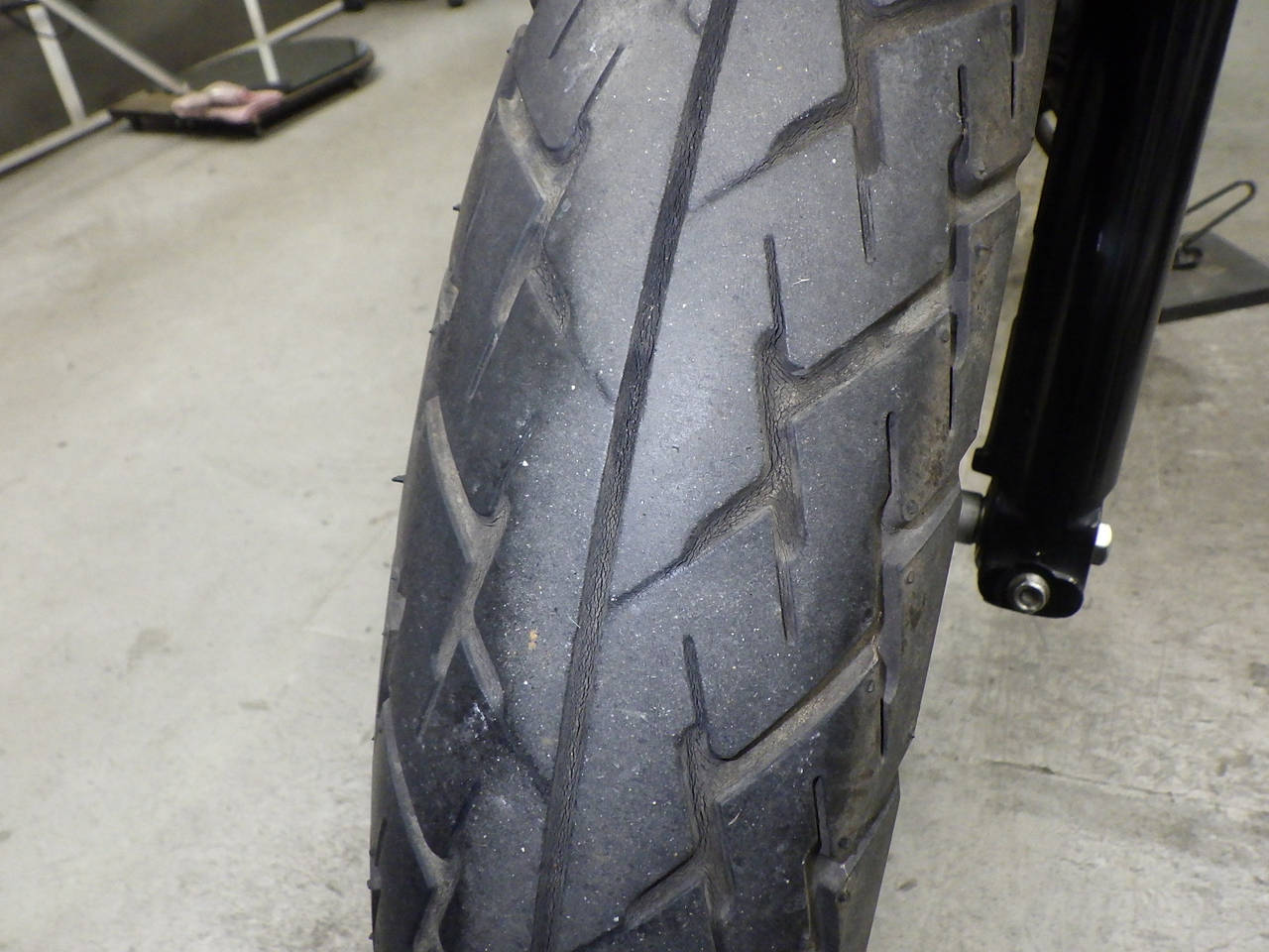 Передняя покрышка: Снижение давления в шине, Трещина требует замены.