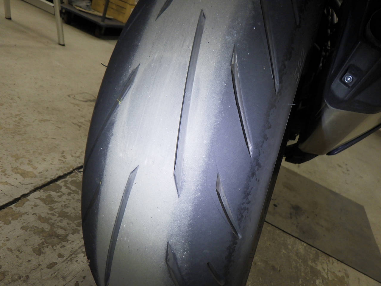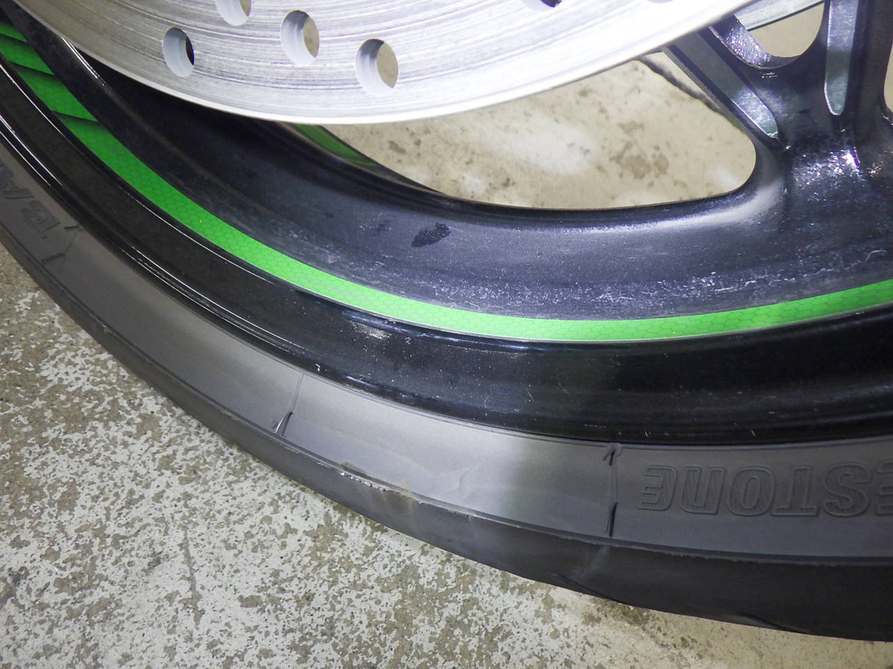 Передняя покрышка: Снижение давления в шине, Трещина требует замены.